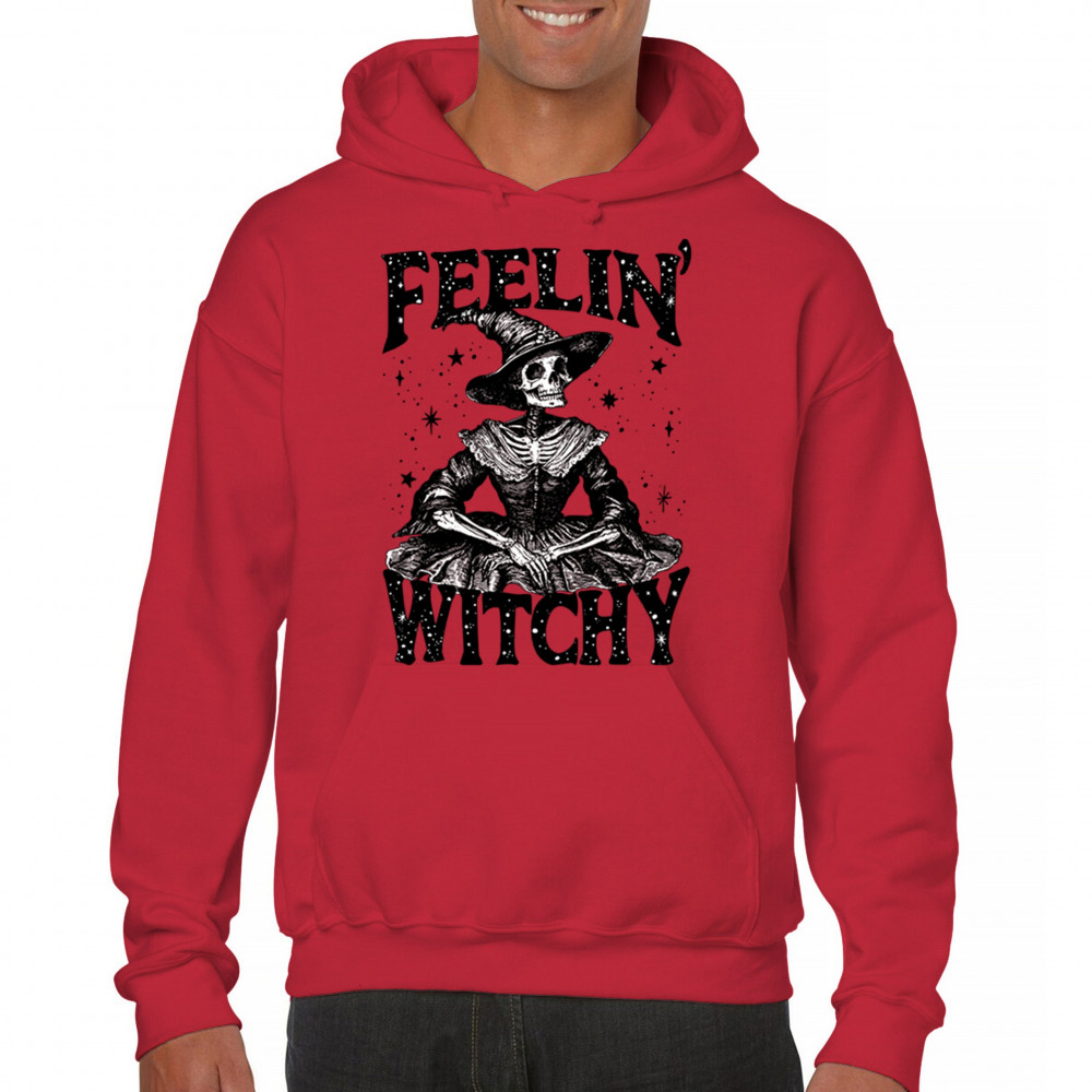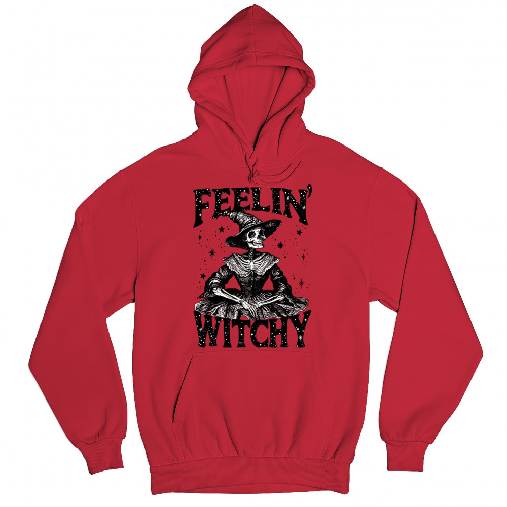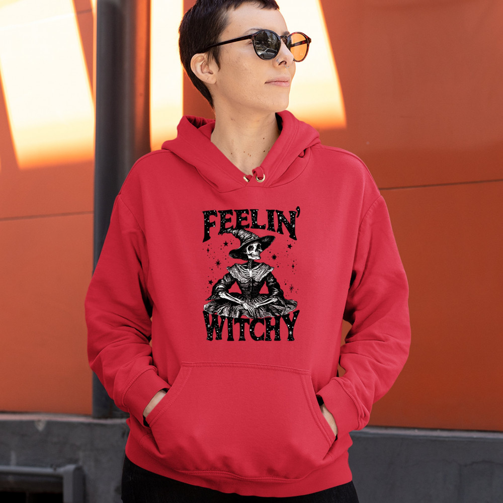 Add a touch of enchantment to your wardrobe with this "Feelin' Witchy" design. Perfect for Halloween, themed parties, or everyday wear, this piece captures gothic aesthetics with playful charm. Featuring a skeleton dressed as a witch, it celebrates the lighter side of spooky fashion. Ideal for those who enjoy blending whimsy with the supernatural, it's a must-have for the season.