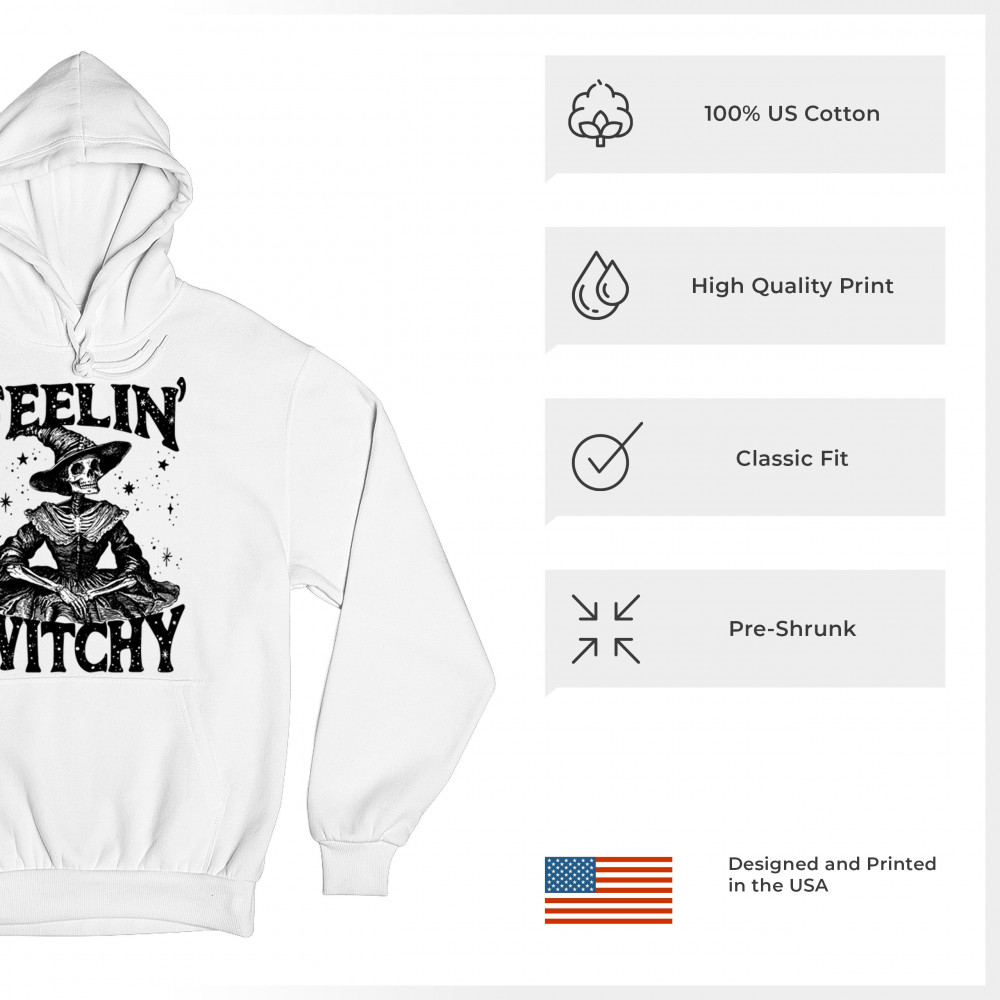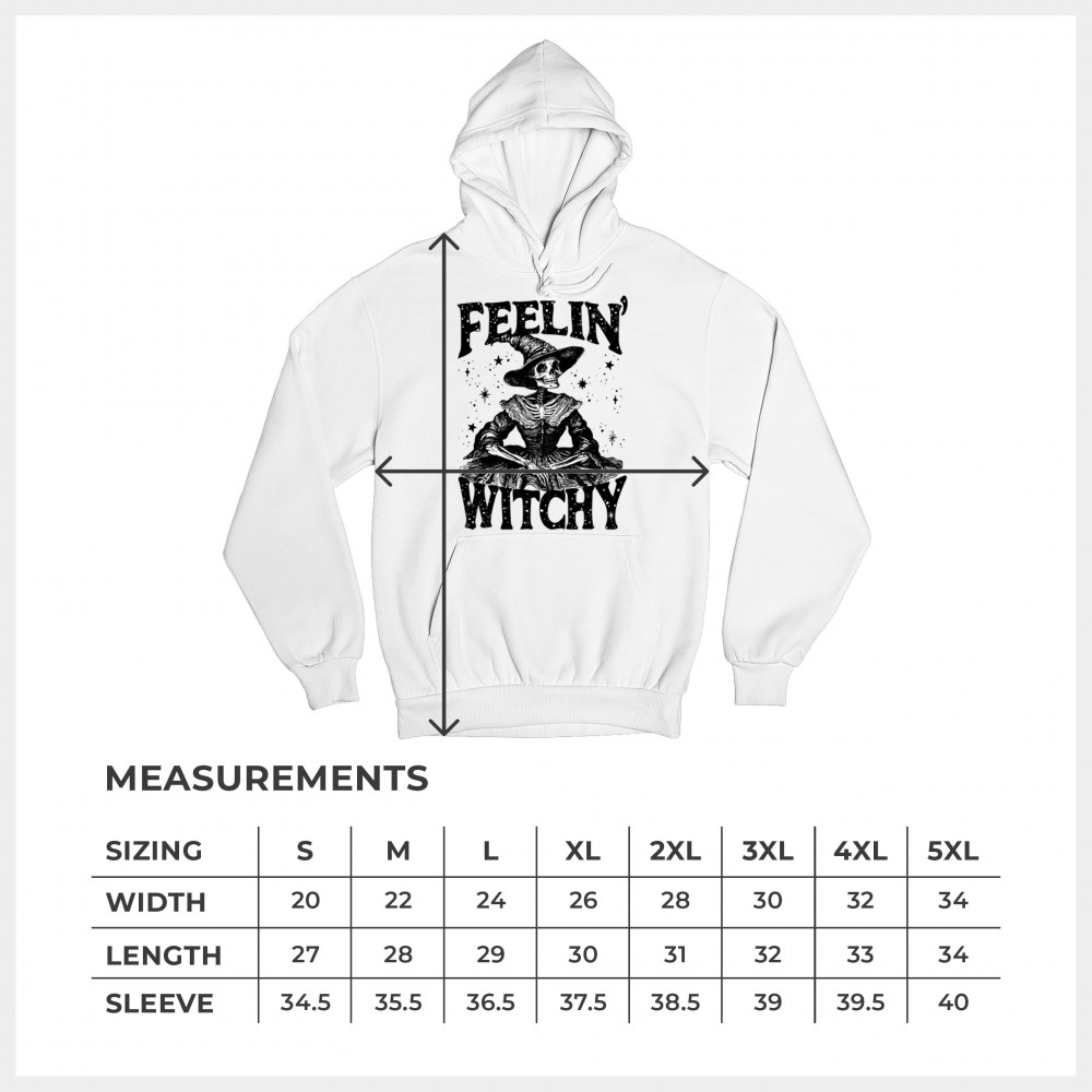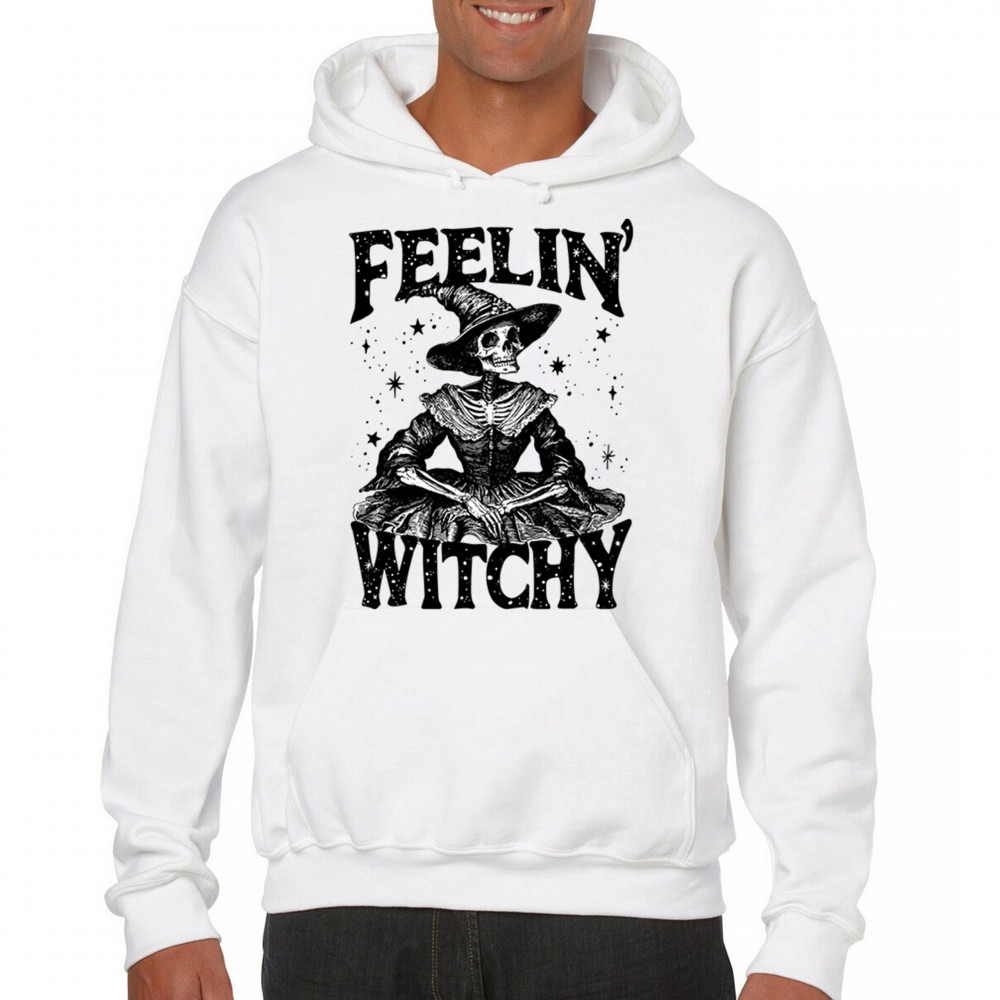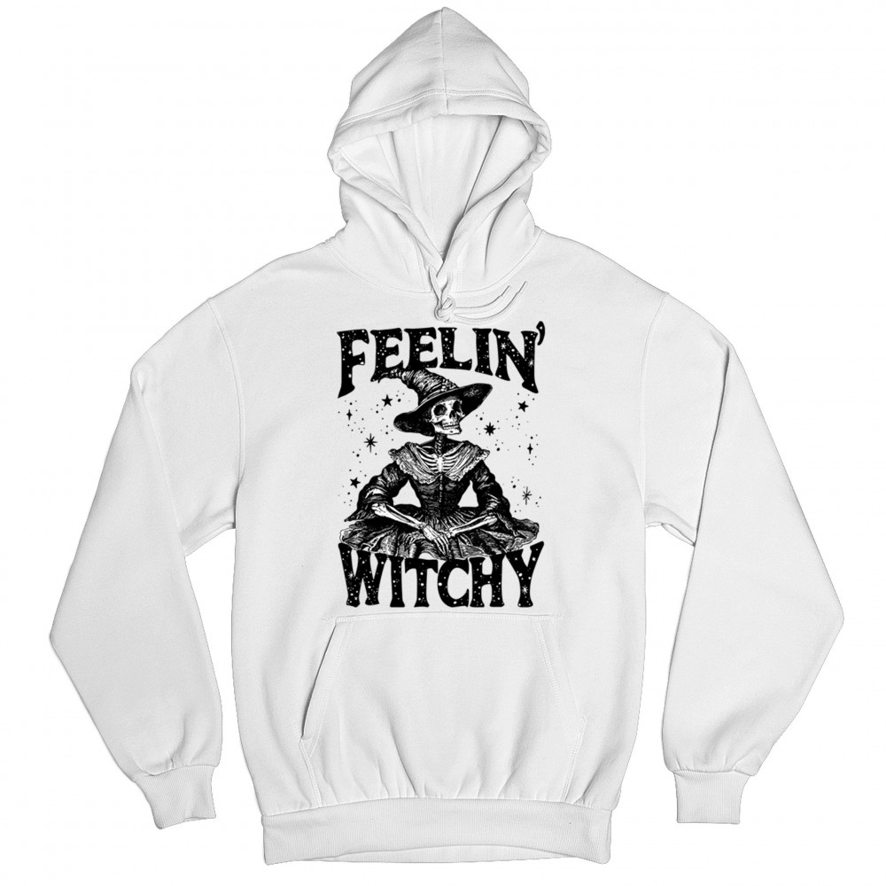Add a touch of enchantment to your wardrobe with this "Feelin' Witchy" design. Perfect for Halloween, themed parties, or everyday wear, this piece captures gothic aesthetics with playful charm. Featuring a skeleton dressed as a witch, it celebrates the lighter side of spooky fashion. Ideal for those who enjoy blending whimsy with the supernatural, it's a must-have for the season.