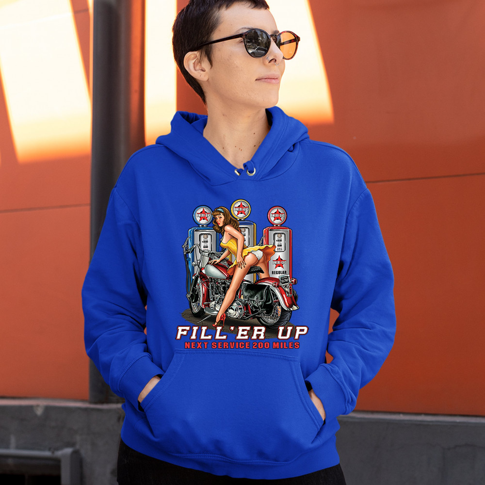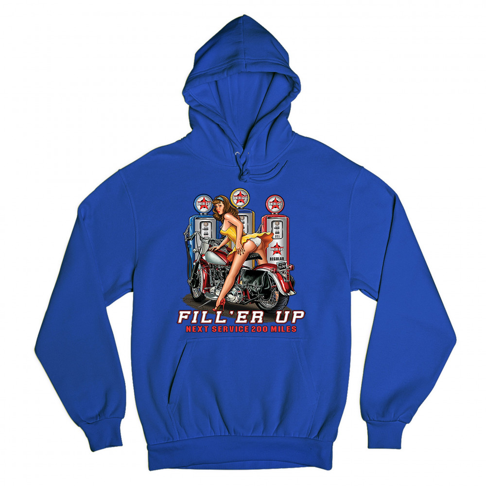 FILL 'ER UP sweatshirt sexy pin-up girl biker rider live to ride hoodie royal blue