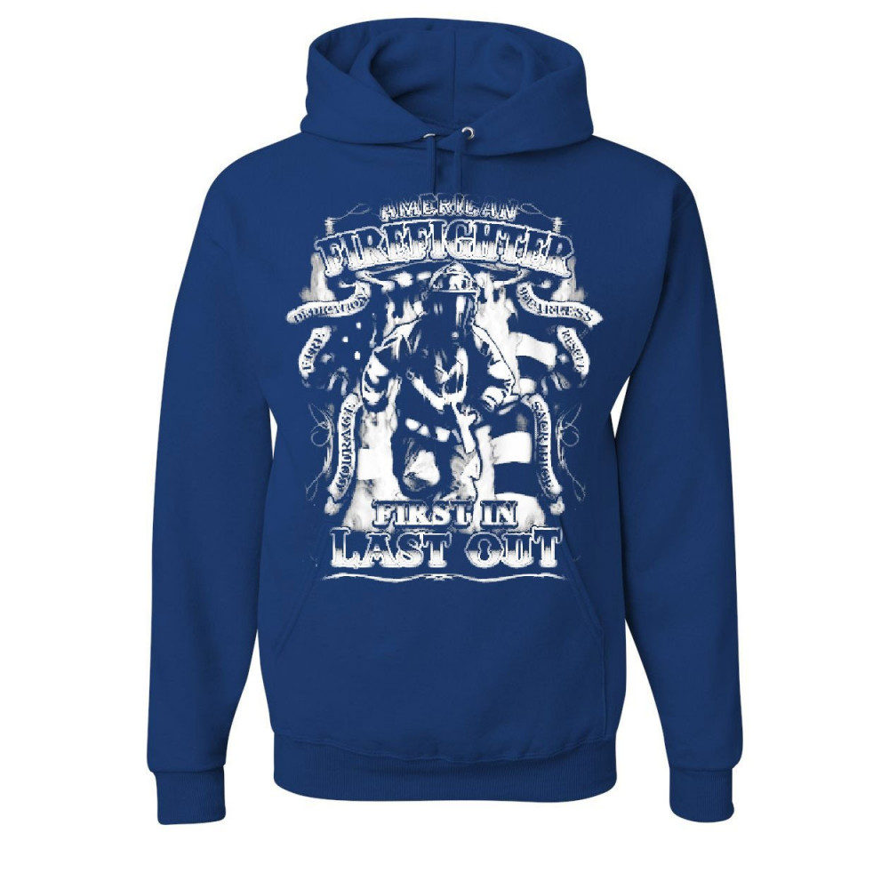 AMERICAN FIREFIGHTER FIRST IN LAST OUT hoodie fire rescue sweatshirt royal blue