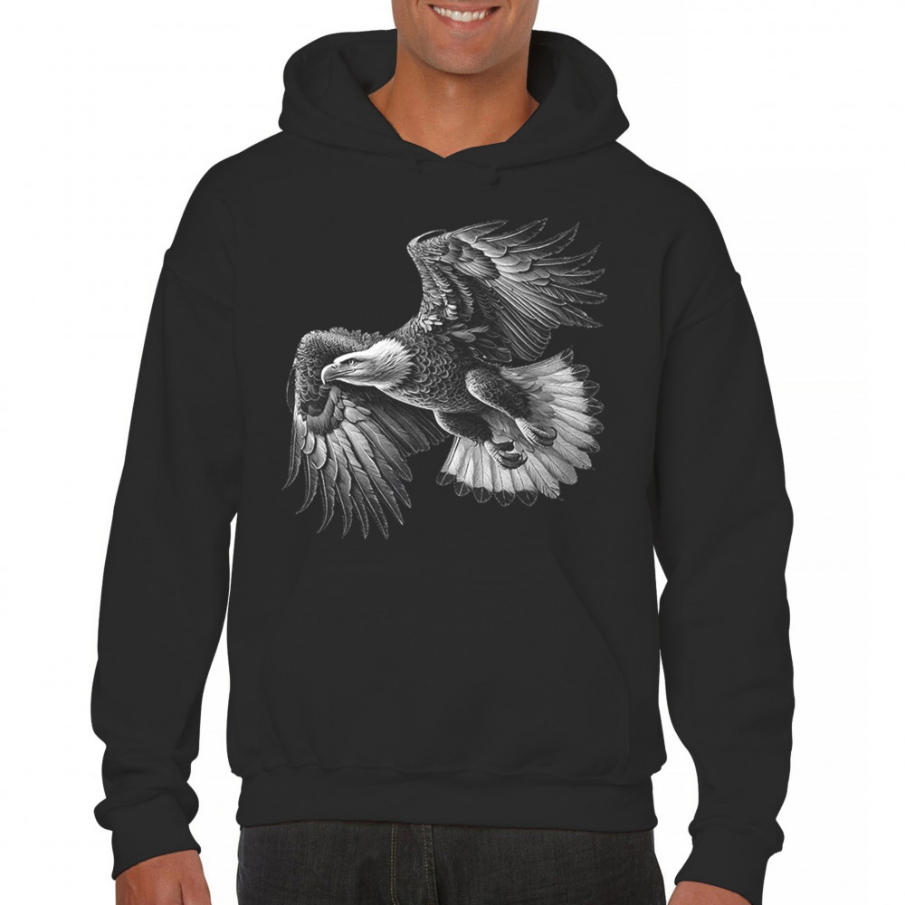 Celebrate American pride with this soaring bald eagle design. With wings extended and monochrome detail that symbolizes liberty and strength, it's perfect for patriots, veterans, and national holiday wear. A timeless tribute to freedom, this design is ideal for memorial events, rallies, and anyone who honors the red, white, and blue.