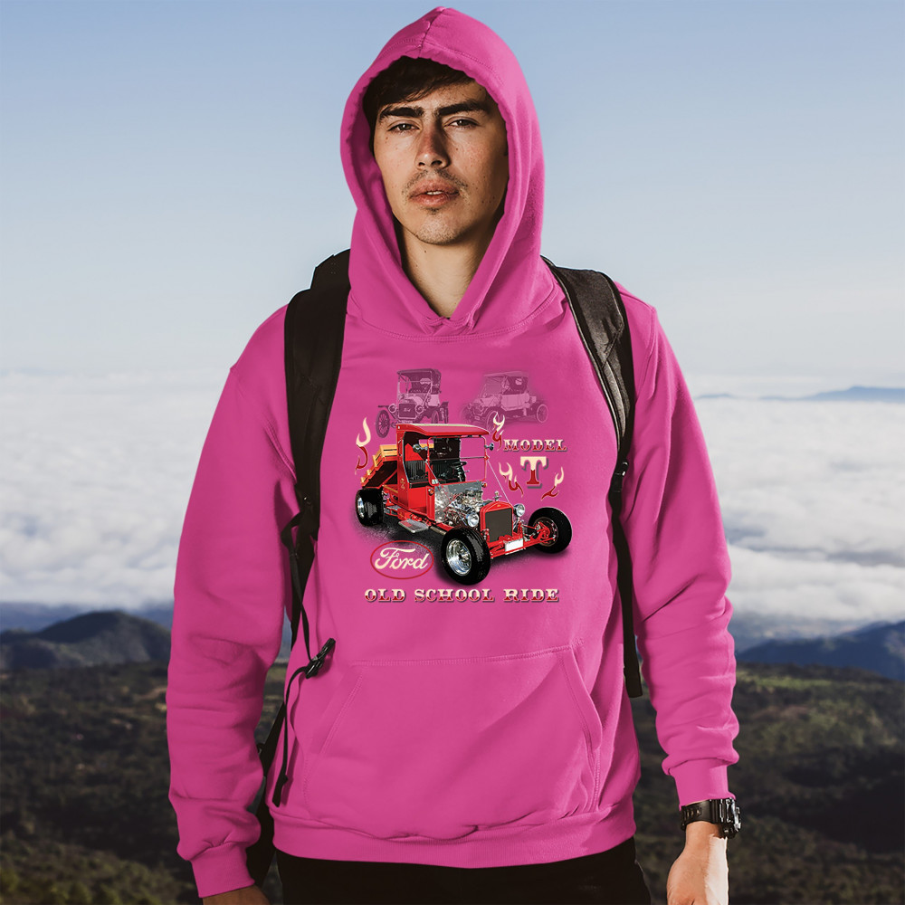 A print featuring a Ford Model T modified as a hot rod. The are also two transparent pictures of original T Models in the background. The print features the Ford logo and says: "Model T, Old School Ride". A great choice for anyone who is a fan of old sch