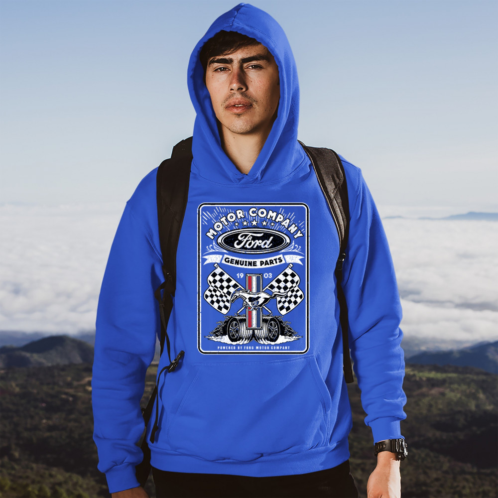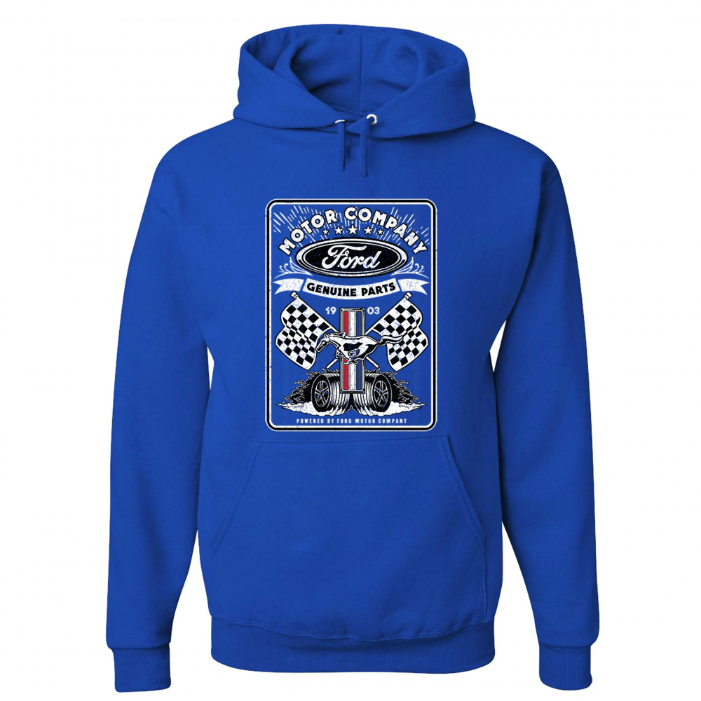 A print featuring Ford logo in the top, Mustang logo in the center, two racing flags and two rolling wheels. The prints says: "Ford Motor Company Genuine Parts 1903" in the top and "Powered by Ford Motor Company" in the bottom. A great choice for anyone w