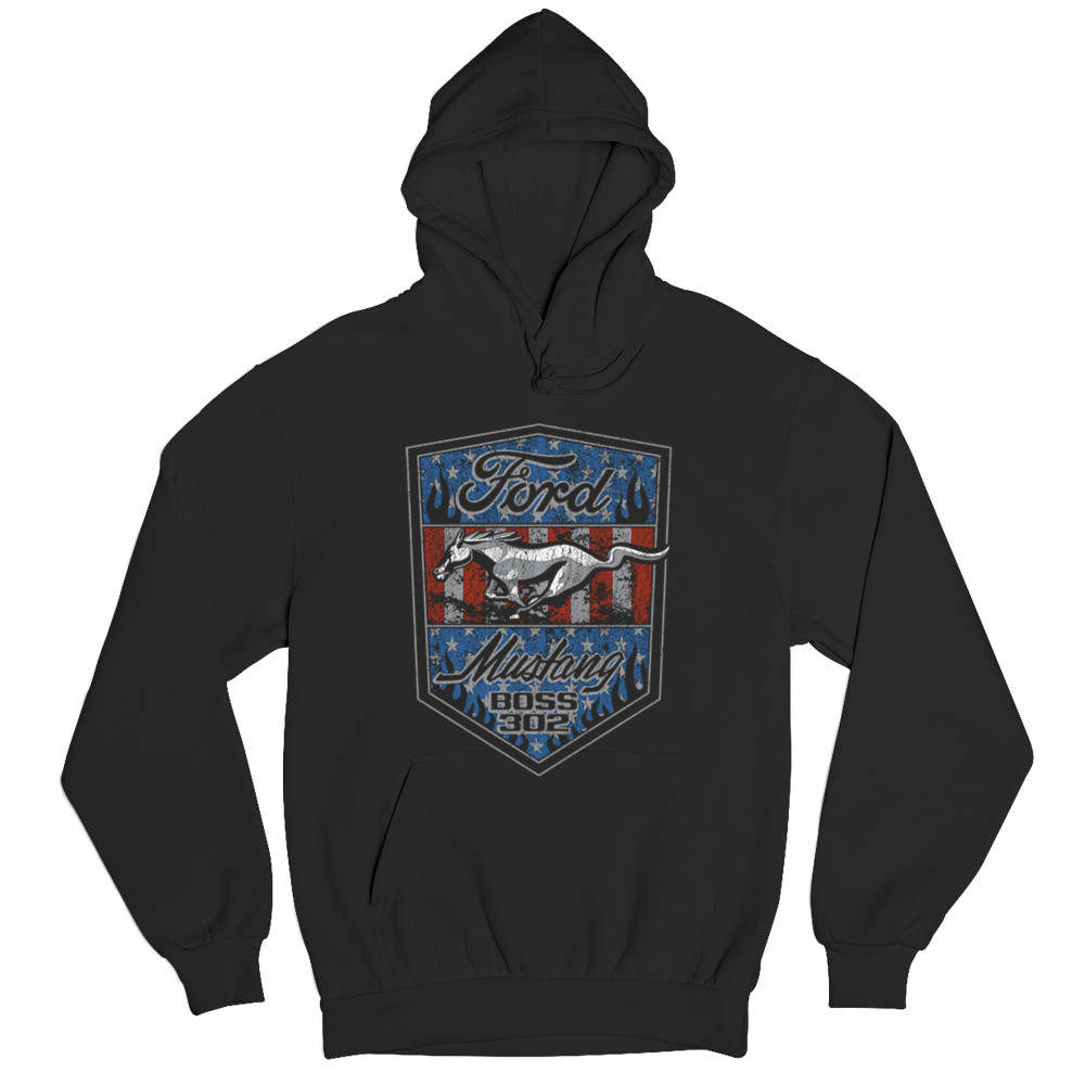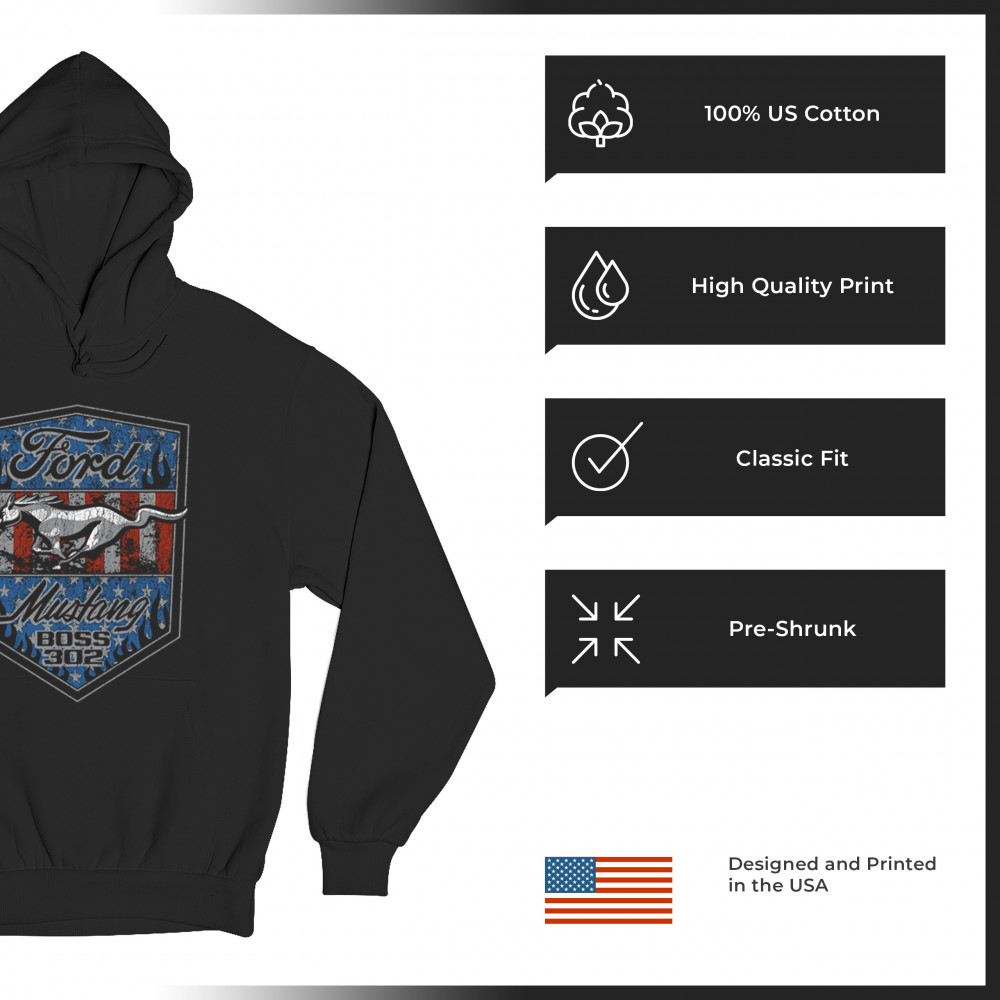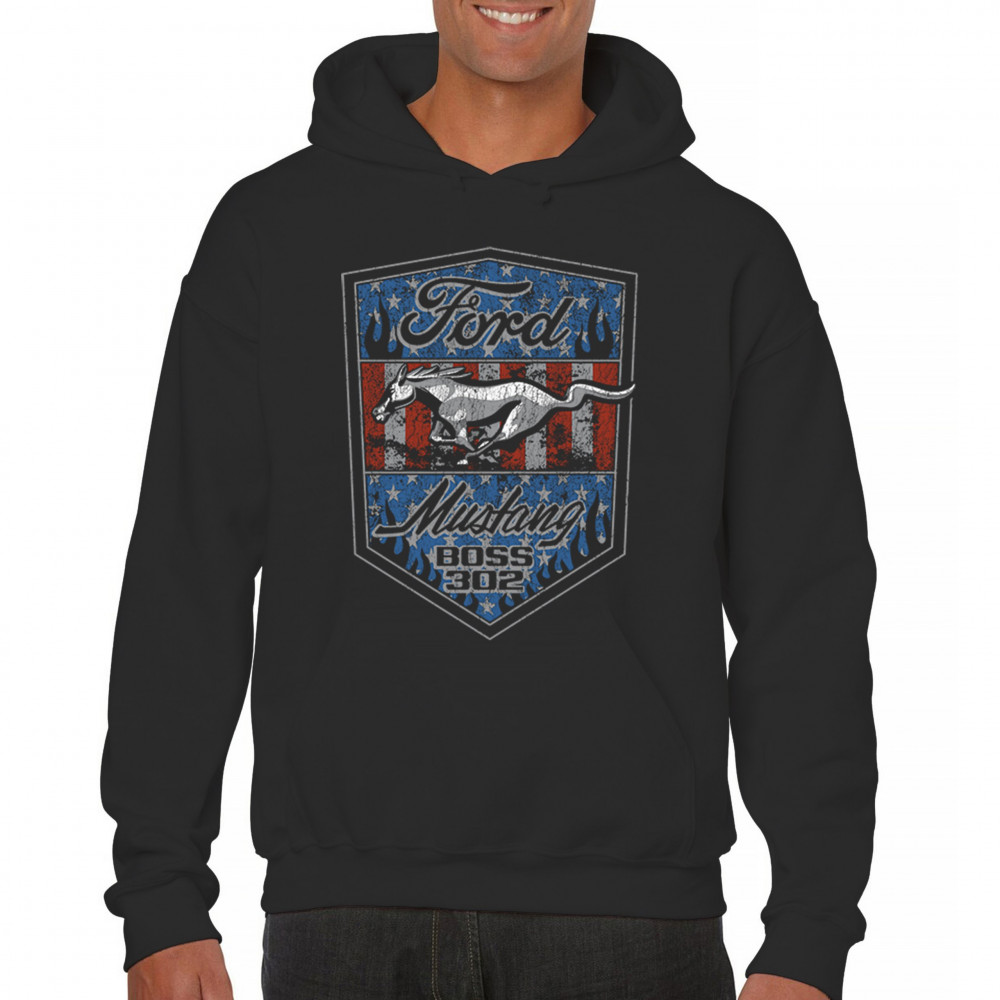 Honor the Ford Mustang Boss 302 legacy with this officially licensed patriotic design, featuring bold flames, the iconic running Mustang, and vintage American muscle style.