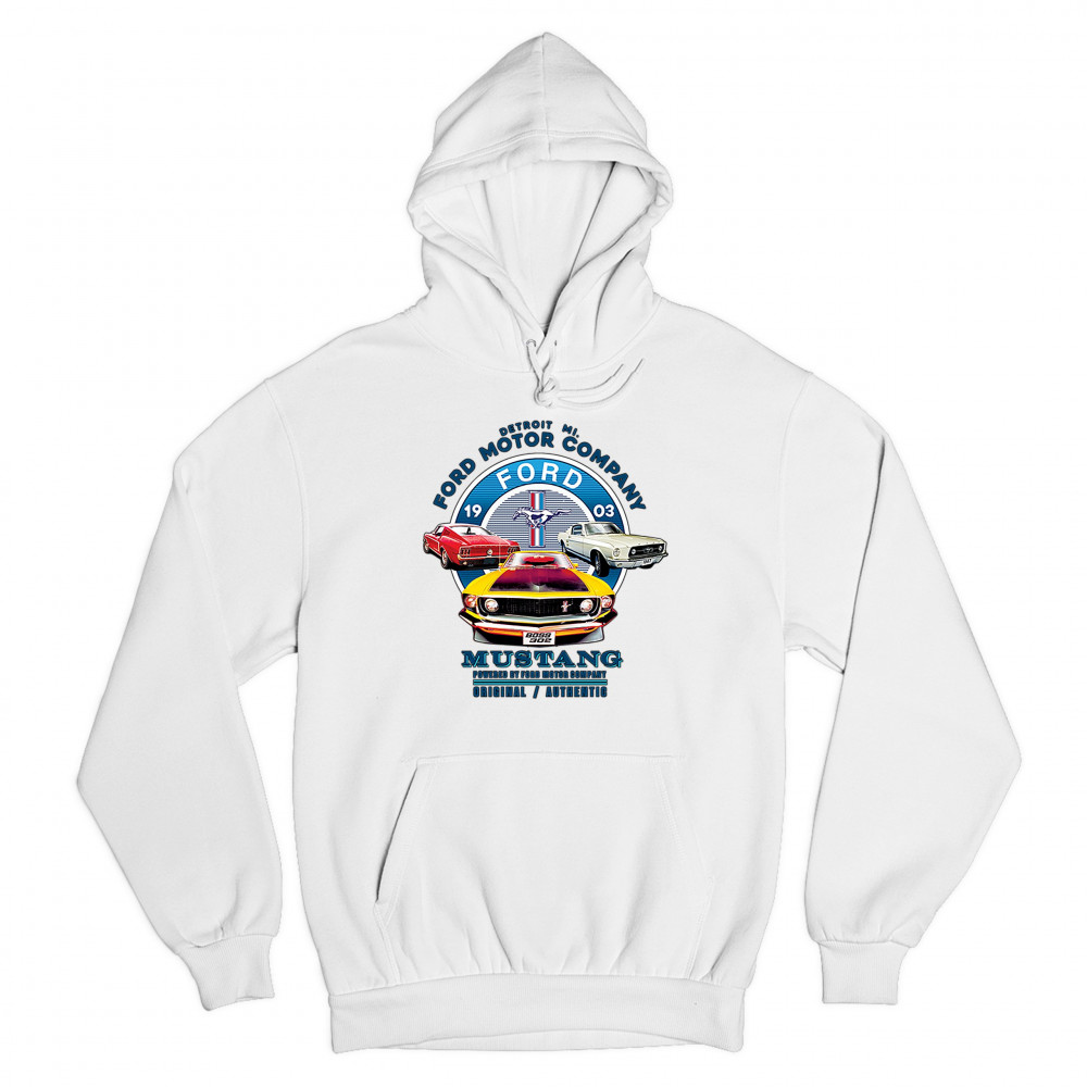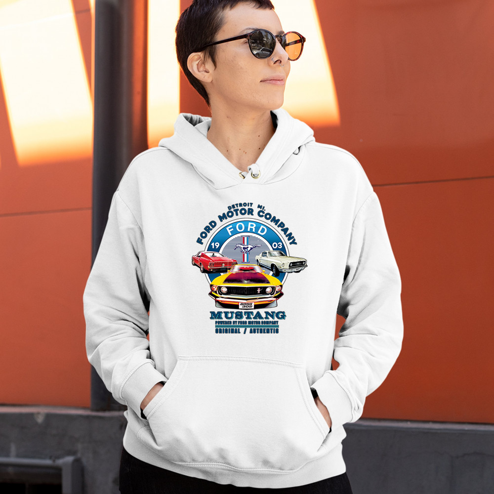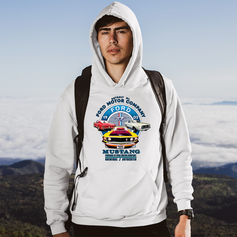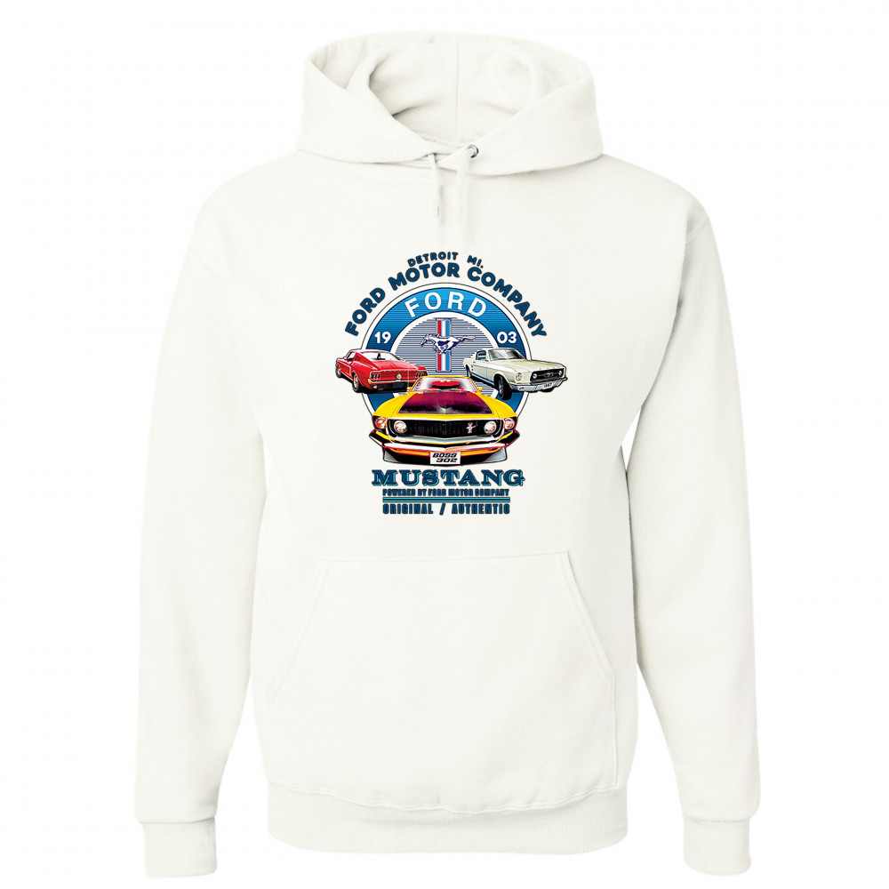 A print featuring three classic Ford Mustangs and their logo in the center. The print says: "Detroit Mi. Ford Motor Company, 1903 Ford Mustang, Powered by Ford Motor Company, Original/Authentic". A great choice for anyone who is a fan of old school Ford M