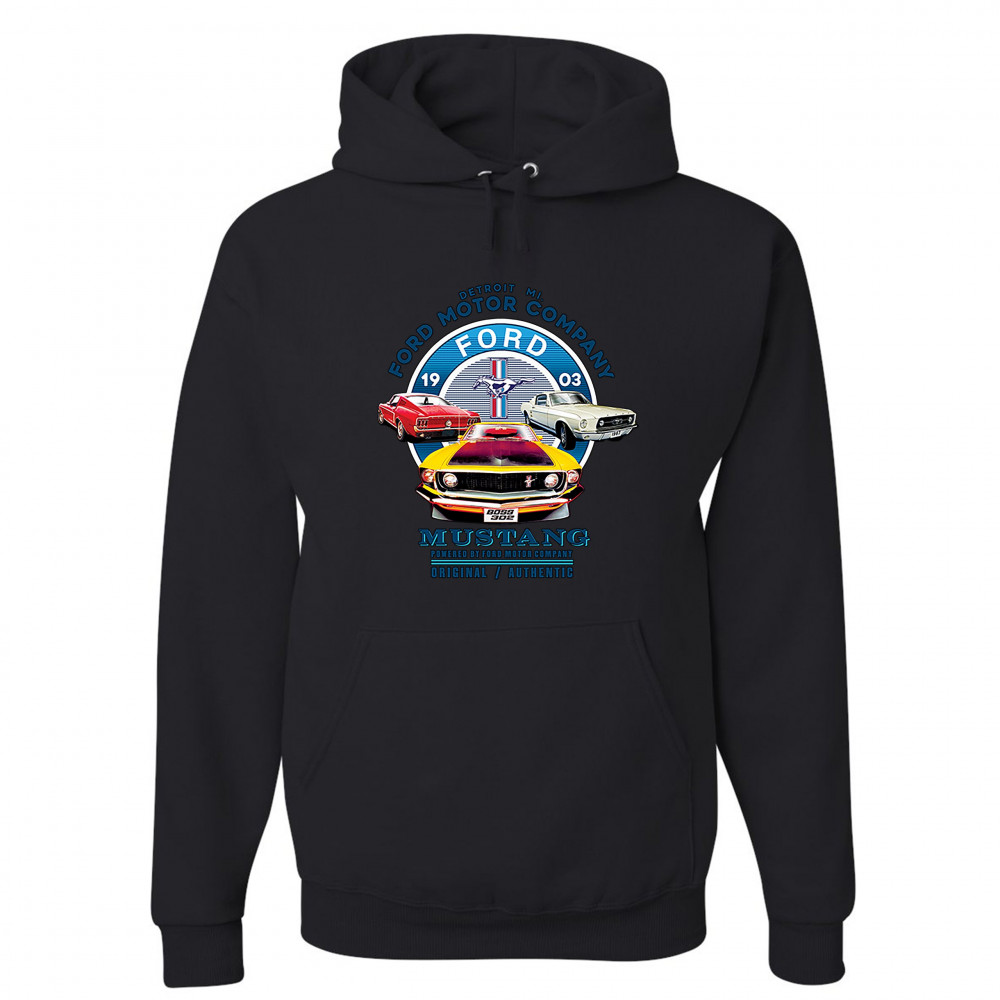 A print featuring three classic Ford Mustangs and their logo in the center. The print says: "Detroit Mi. Ford Motor Company, 1903 Ford Mustang, Powered by Ford Motor Company, Original/Authentic". A great choice for anyone who is a fan of old school Ford M