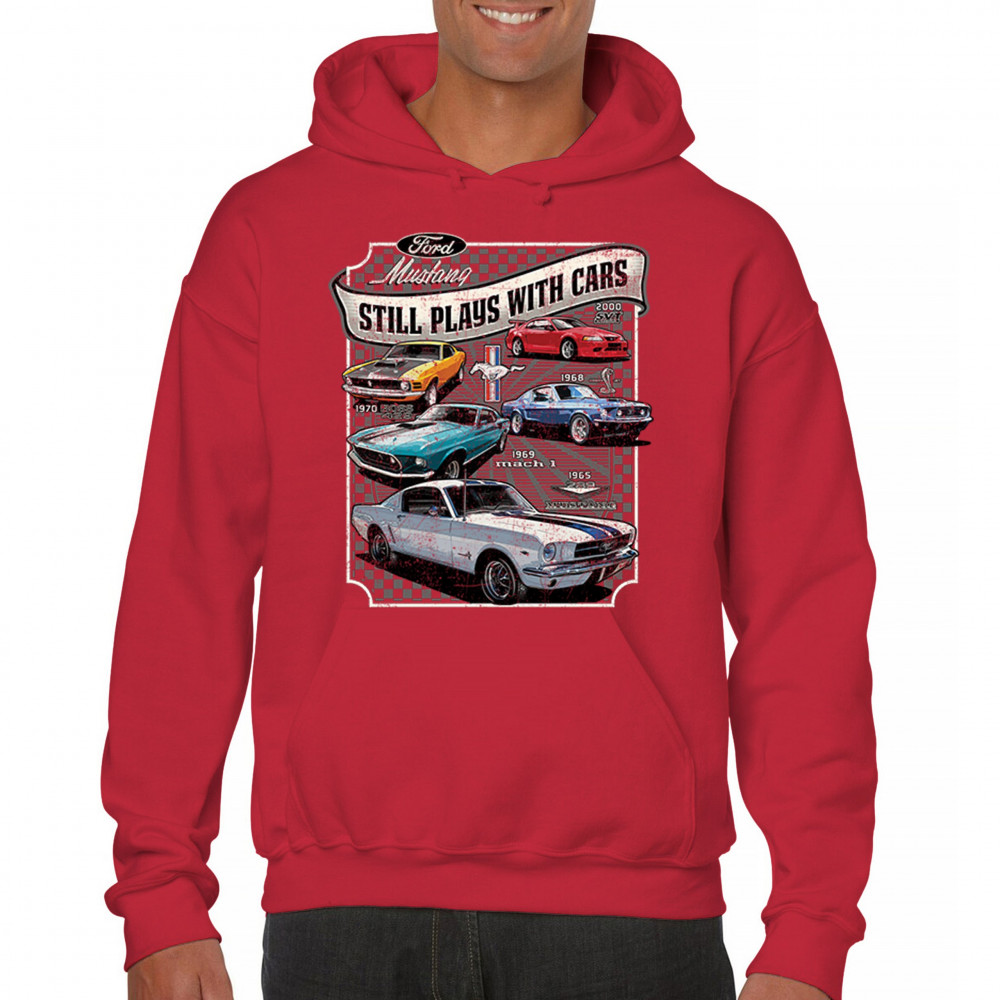 This bold Ford Mustang "Still Plays With Cars" design showcases six classic models from 1965 to 2000, including the 1969 Mach 1, 1970 Boss 302, and 2000 SVT. A dream graphic for muscle car lovers, collectors, and pony car fans. Great for classic auto shows, retro cruises, garage wear, or car clubs.