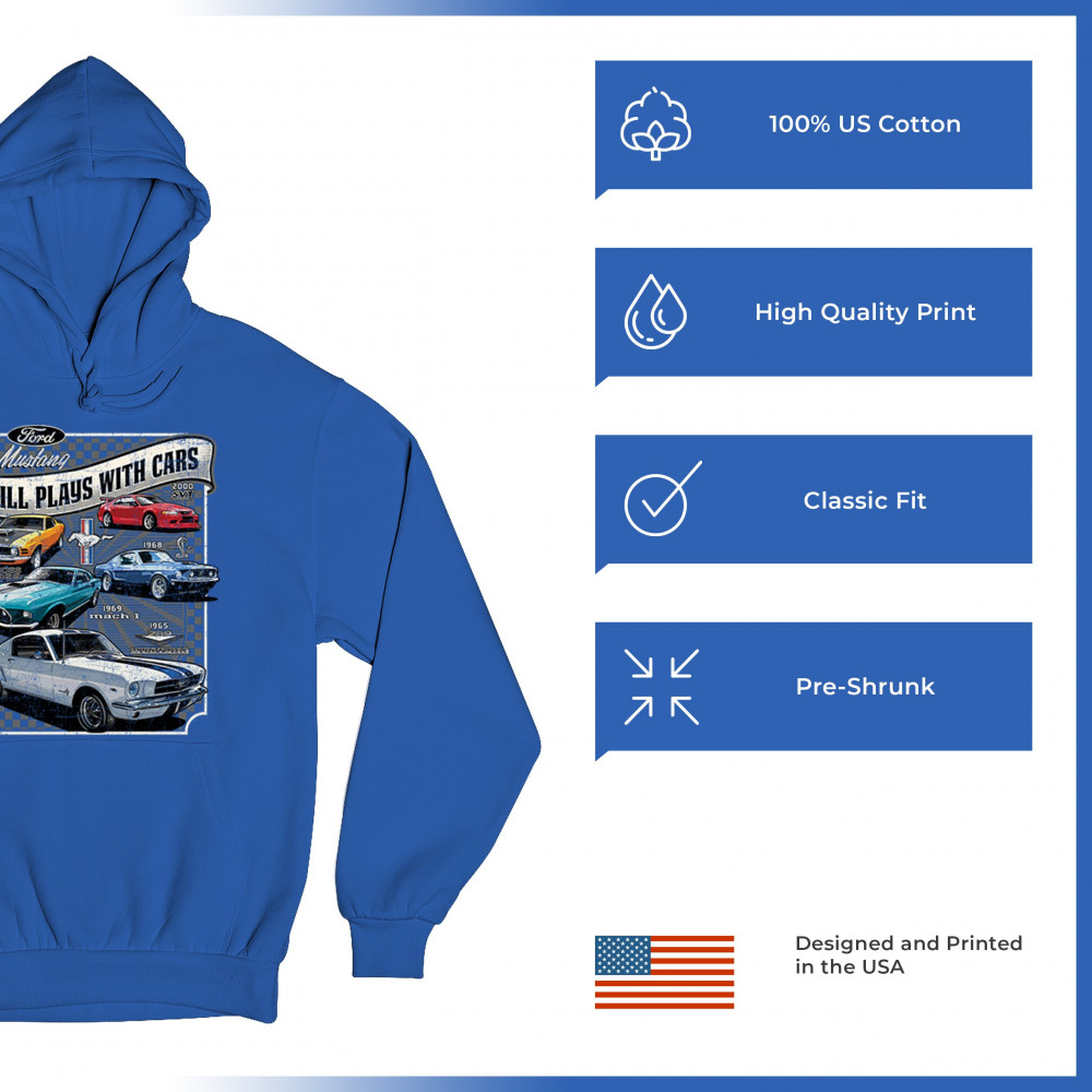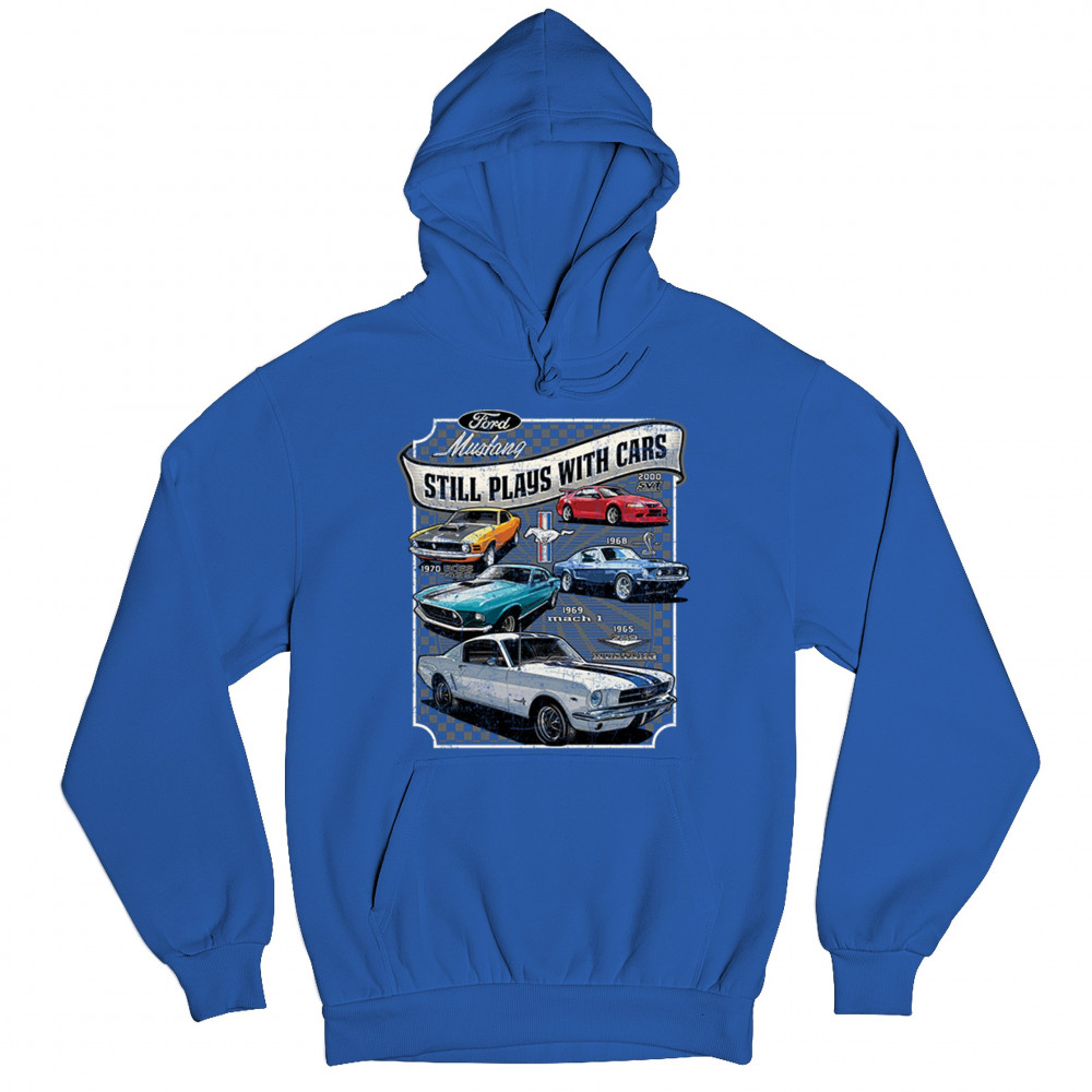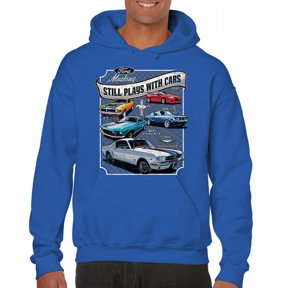 This bold Ford Mustang "Still Plays With Cars" design showcases six classic models from 1965 to 2000, including the 1969 Mach 1, 1970 Boss 302, and 2000 SVT. A dream graphic for muscle car lovers, collectors, and pony car fans. Great for classic auto shows, retro cruises, garage wear, or car clubs.
