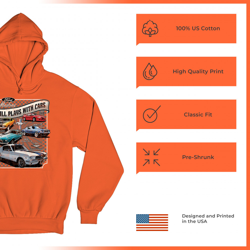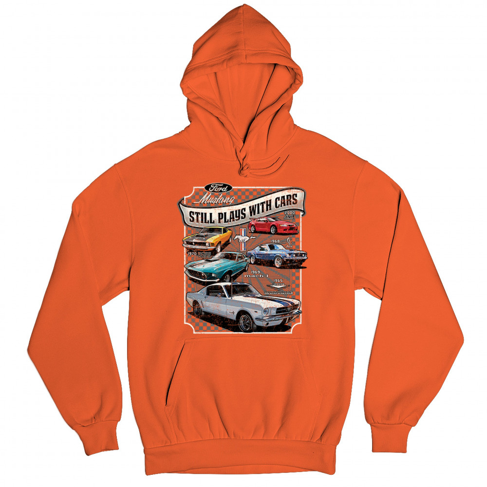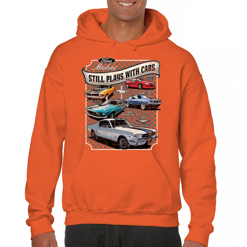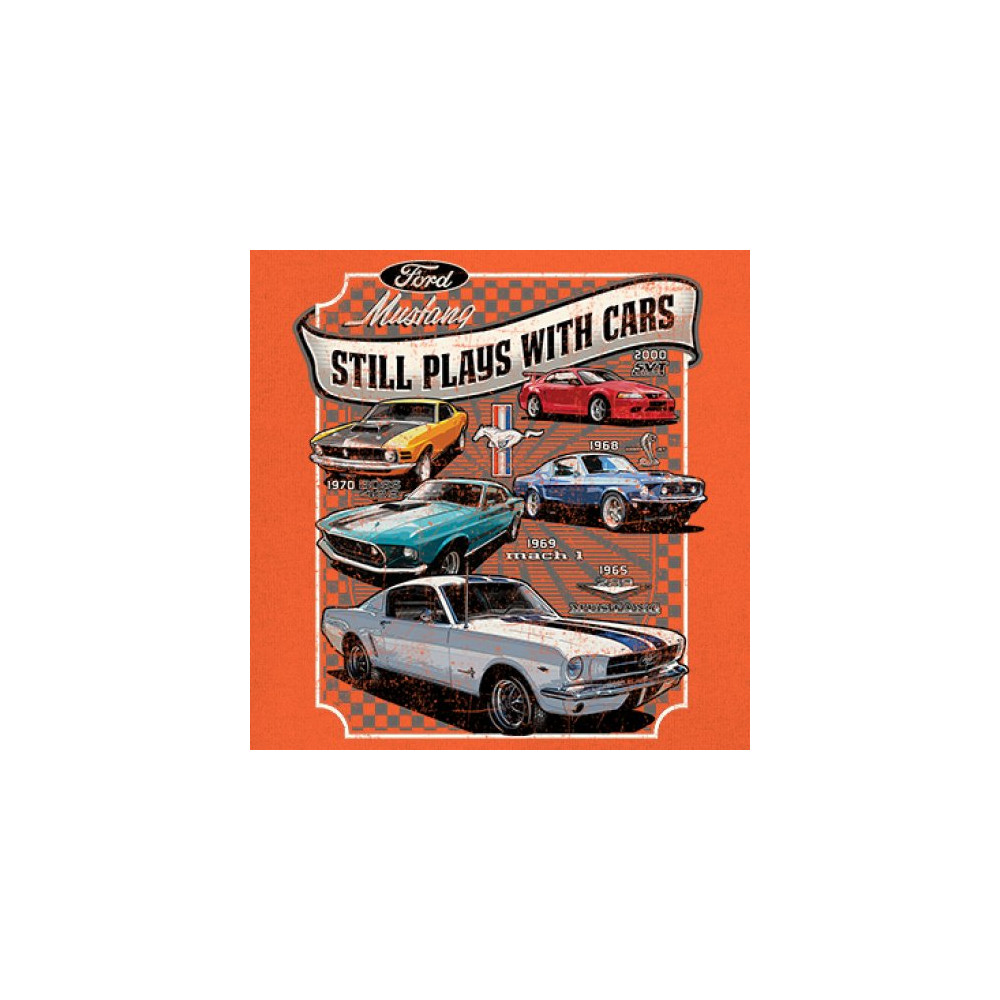 This bold Ford Mustang "Still Plays With Cars" design showcases six classic models from 1965 to 2000, including the 1969 Mach 1, 1970 Boss 302, and 2000 SVT. A dream graphic for muscle car lovers, collectors, and pony car fans. Great for classic auto shows, retro cruises, garage wear, or car clubs.