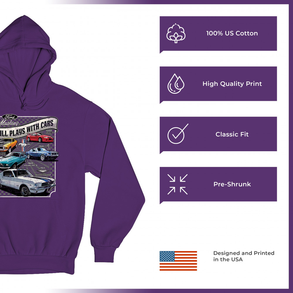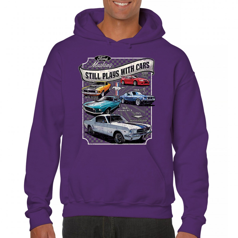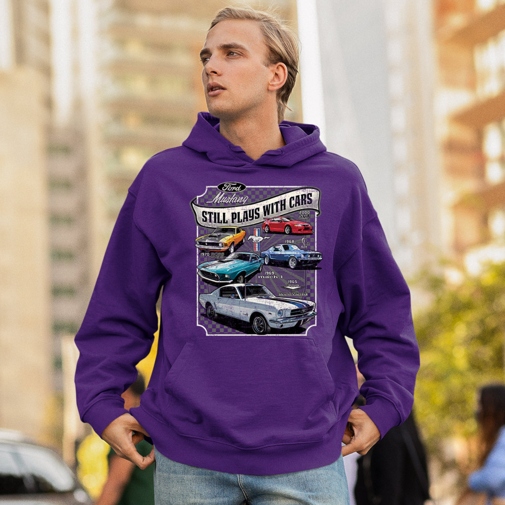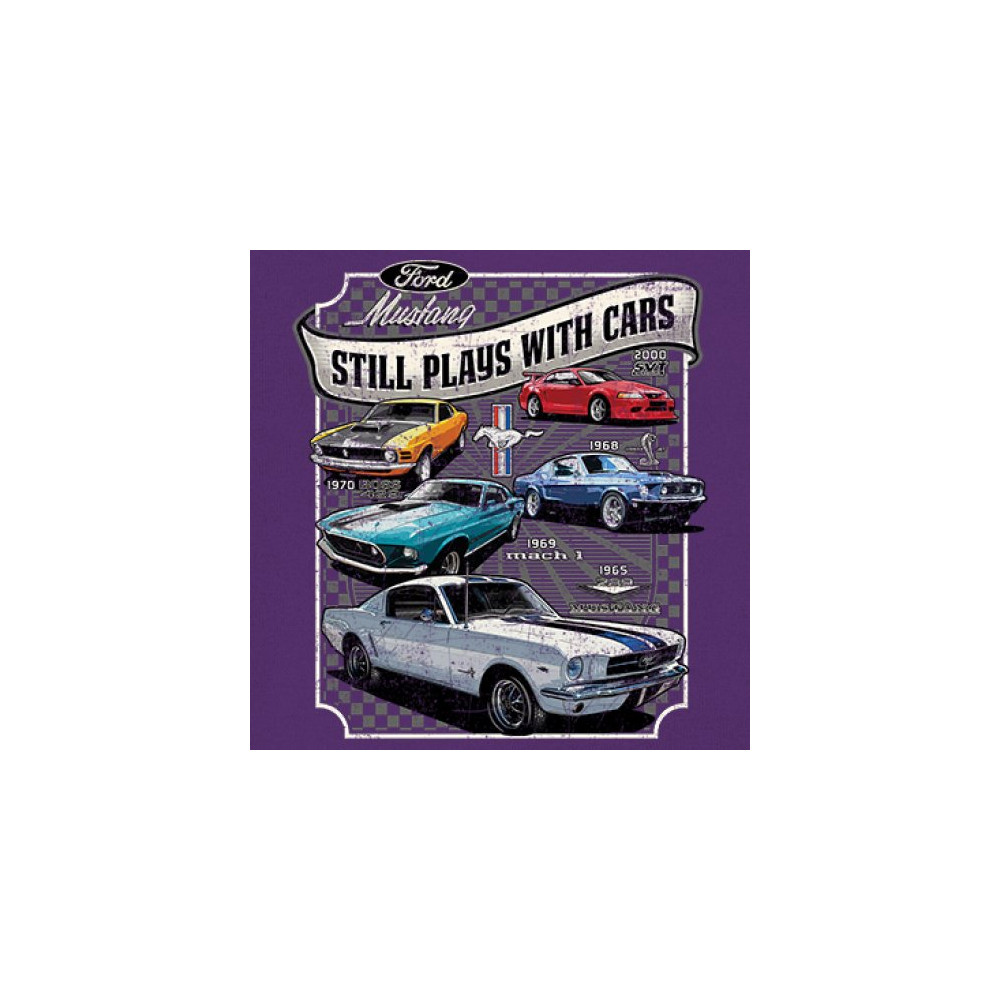 This bold Ford Mustang "Still Plays With Cars" design showcases six classic models from 1965 to 2000, including the 1969 Mach 1, 1970 Boss 302, and 2000 SVT. A dream graphic for muscle car lovers, collectors, and pony car fans. Great for classic auto shows, retro cruises, garage wear, or car clubs.