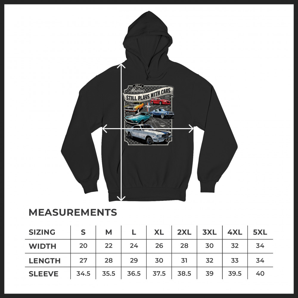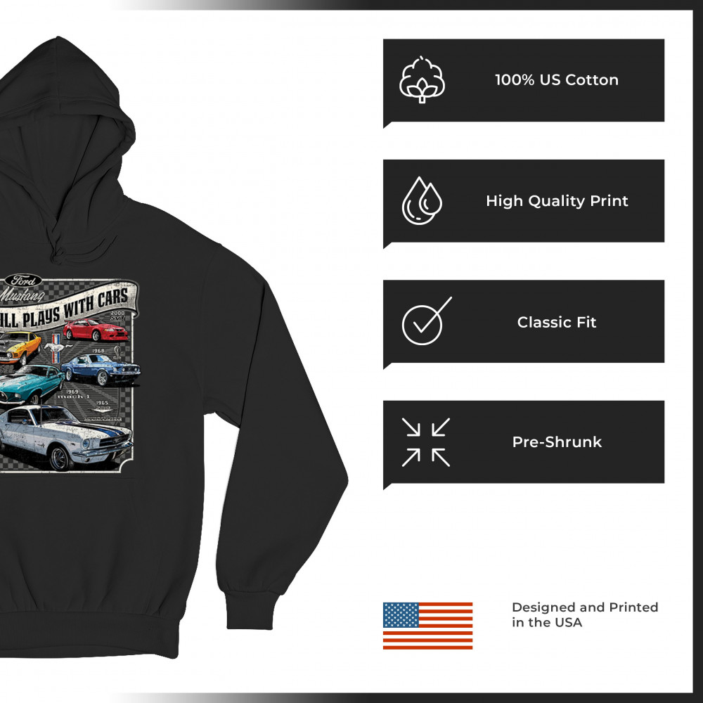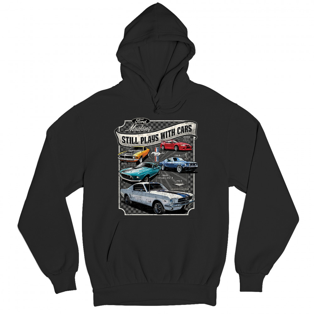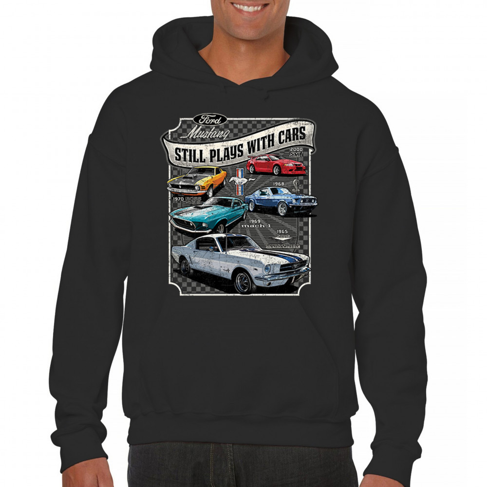 This bold Ford Mustang "Still Plays With Cars" design showcases six classic models from 1965 to 2000, including the 1969 Mach 1, 1970 Boss 302, and 2000 SVT. A dream graphic for muscle car lovers, collectors, and pony car fans. Great for classic auto shows, retro cruises, garage wear, or car clubs.