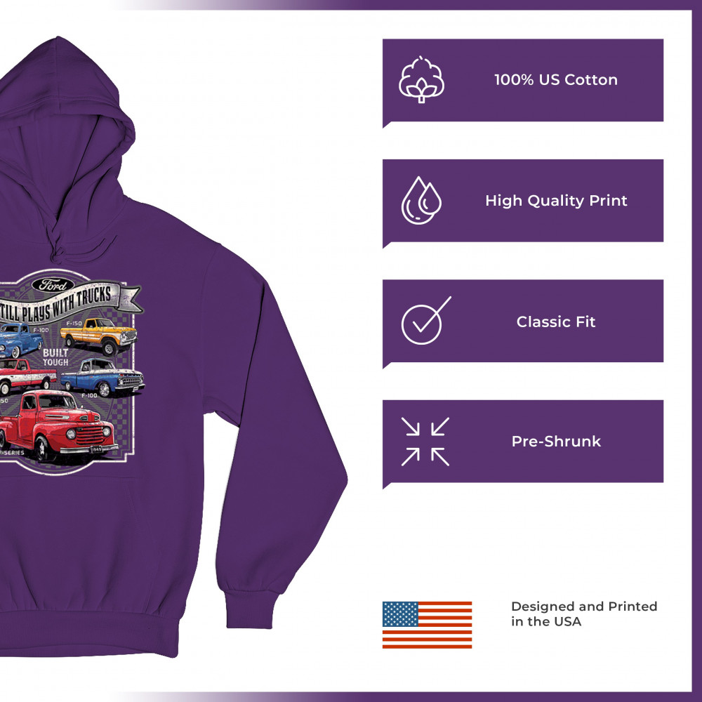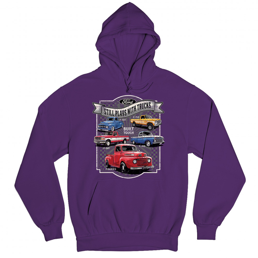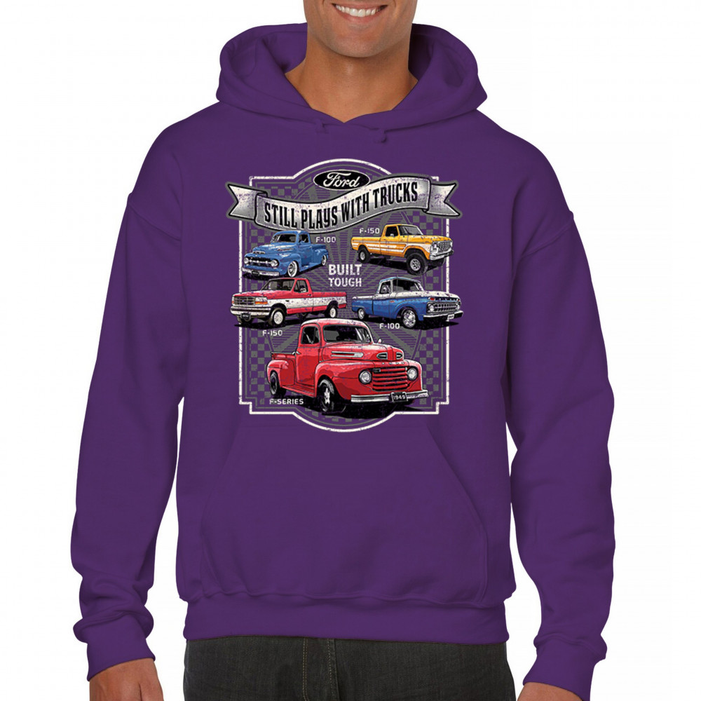 Features classic Ford F-Series trucks from 1949 to F-150. Great for vintage truck fans, garage wear, car shows, and collectors who love pickups.