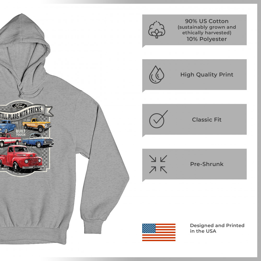 Features classic Ford F-Series trucks from 1949 to F-150. Great for vintage truck fans, garage wear, car shows, and collectors who love pickups.