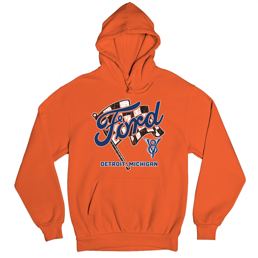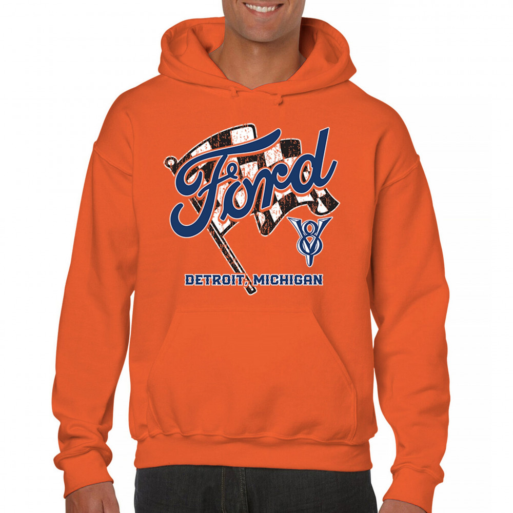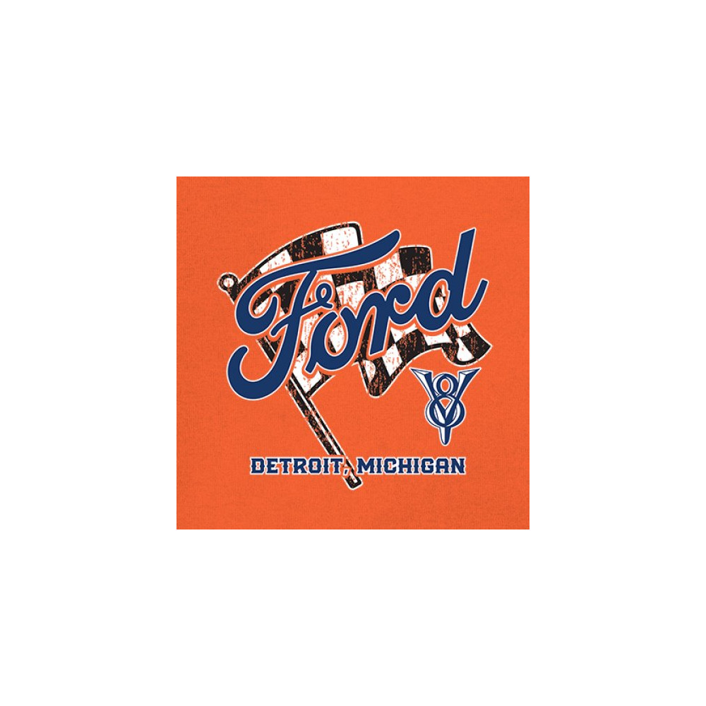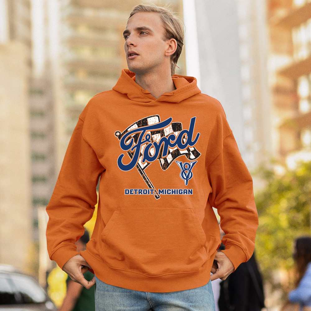 Honor Detroit, Michigan’s Ford legacy with this officially licensed design featuring a checkered flag and bold V8 emblem, perfect for muscle car fans and classic car lovers.