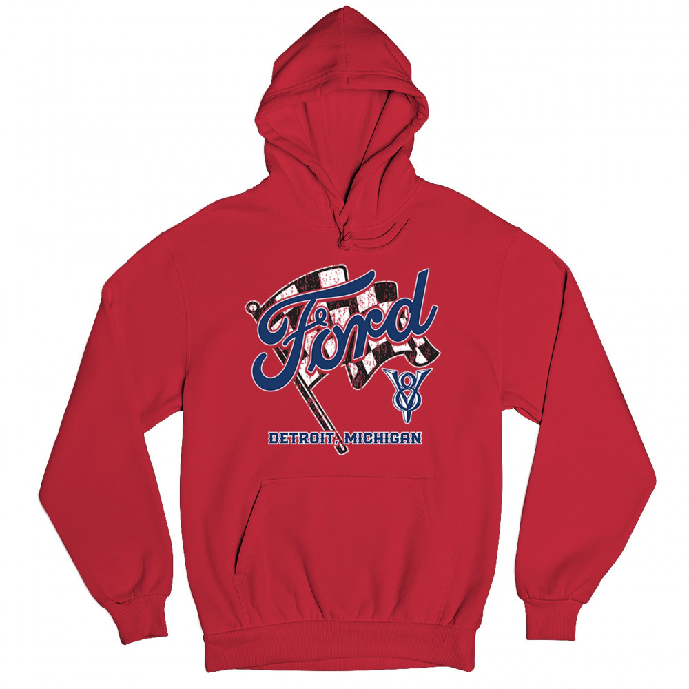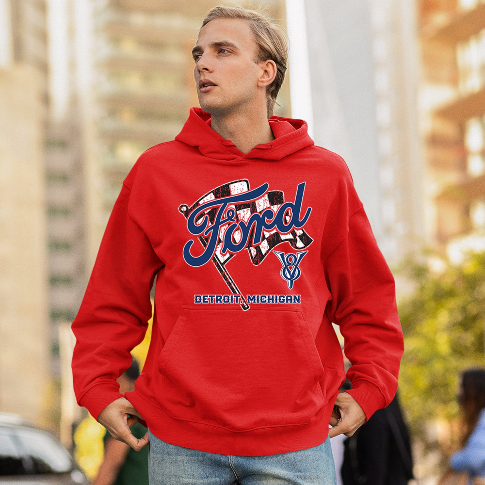 Honor Detroit, Michigan’s Ford legacy with this officially licensed design featuring a checkered flag and bold V8 emblem, perfect for muscle car fans and classic car lovers.