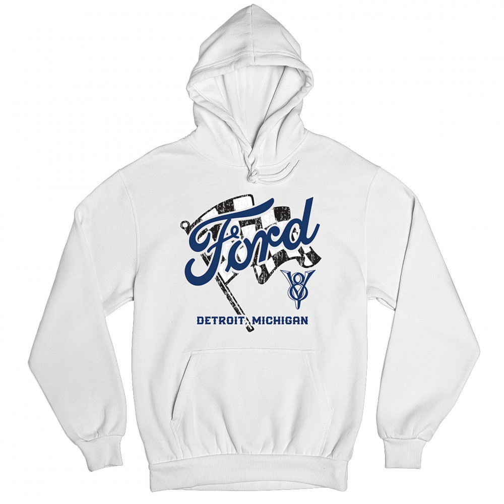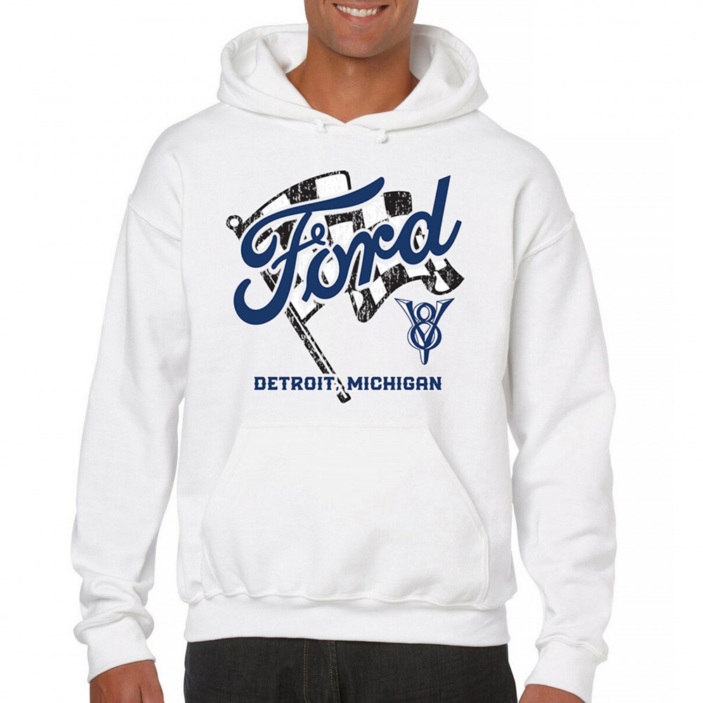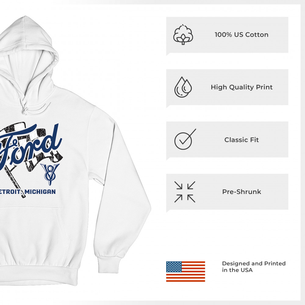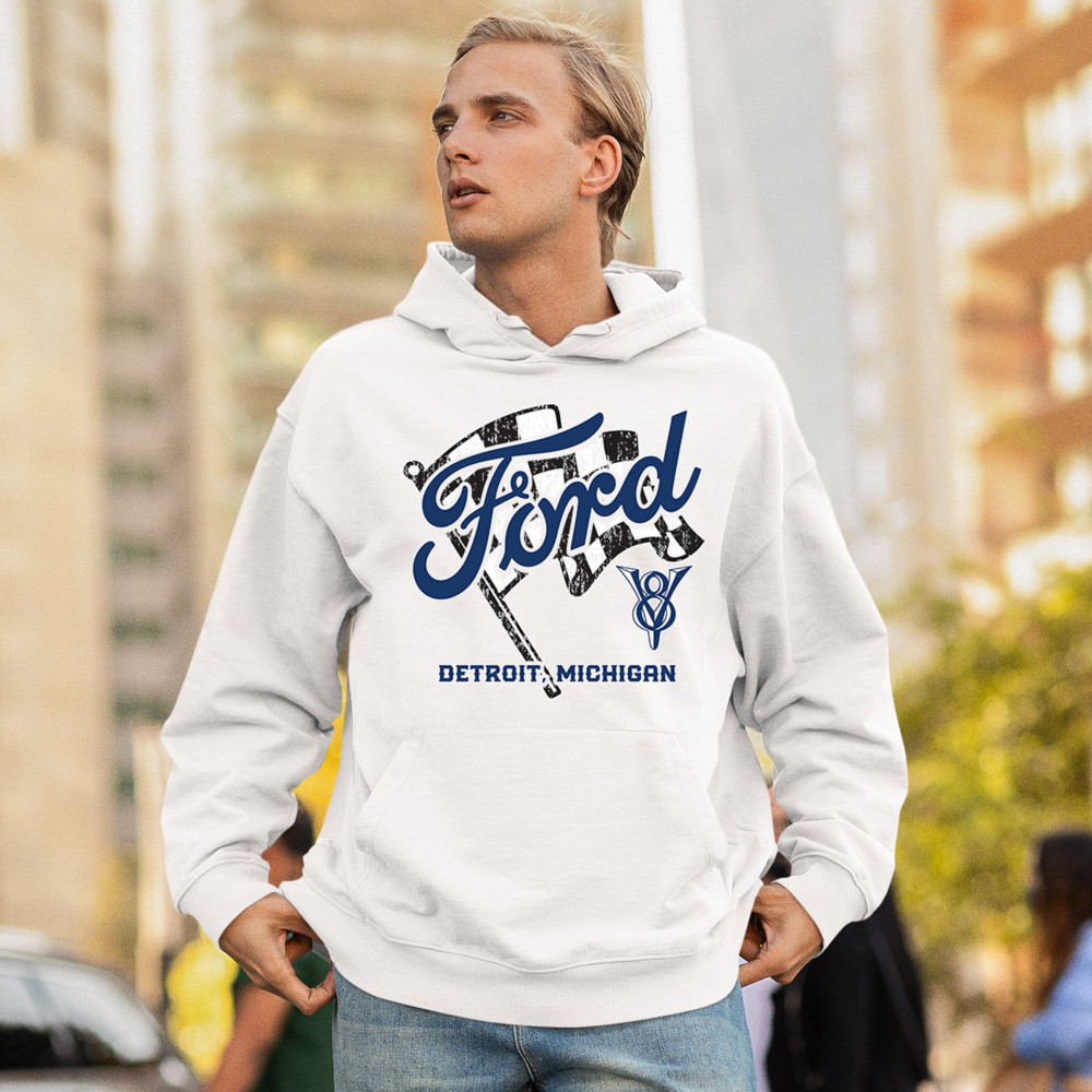 Honor Detroit, Michigan’s Ford legacy with this officially licensed design featuring a checkered flag and bold V8 emblem, perfect for muscle car fans and classic car lovers.