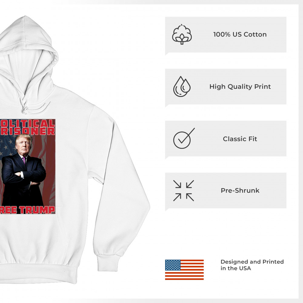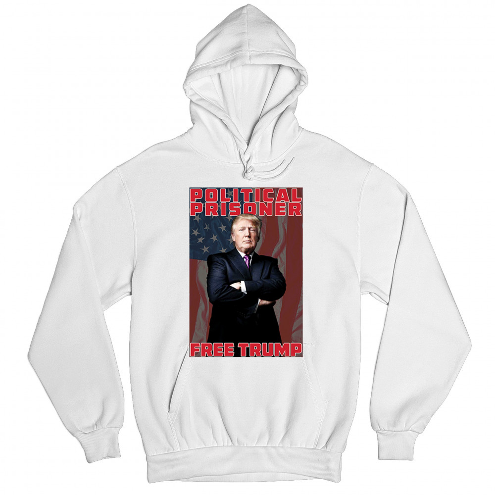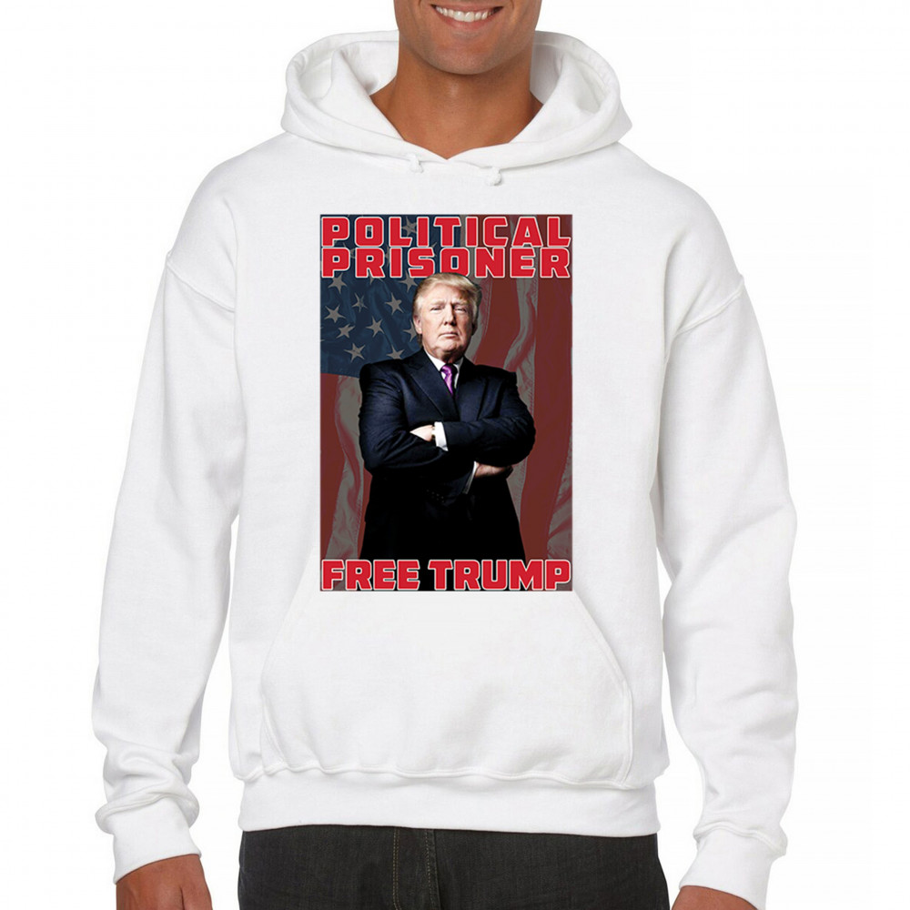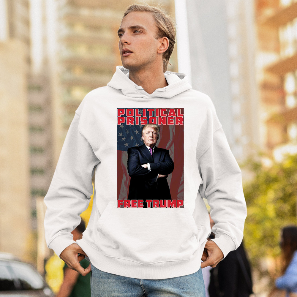 Show your support with the "Political Prisoner Free Trump" design, featuring Trump against an American flag. Perfect for conservative patriots and Trump supporters.