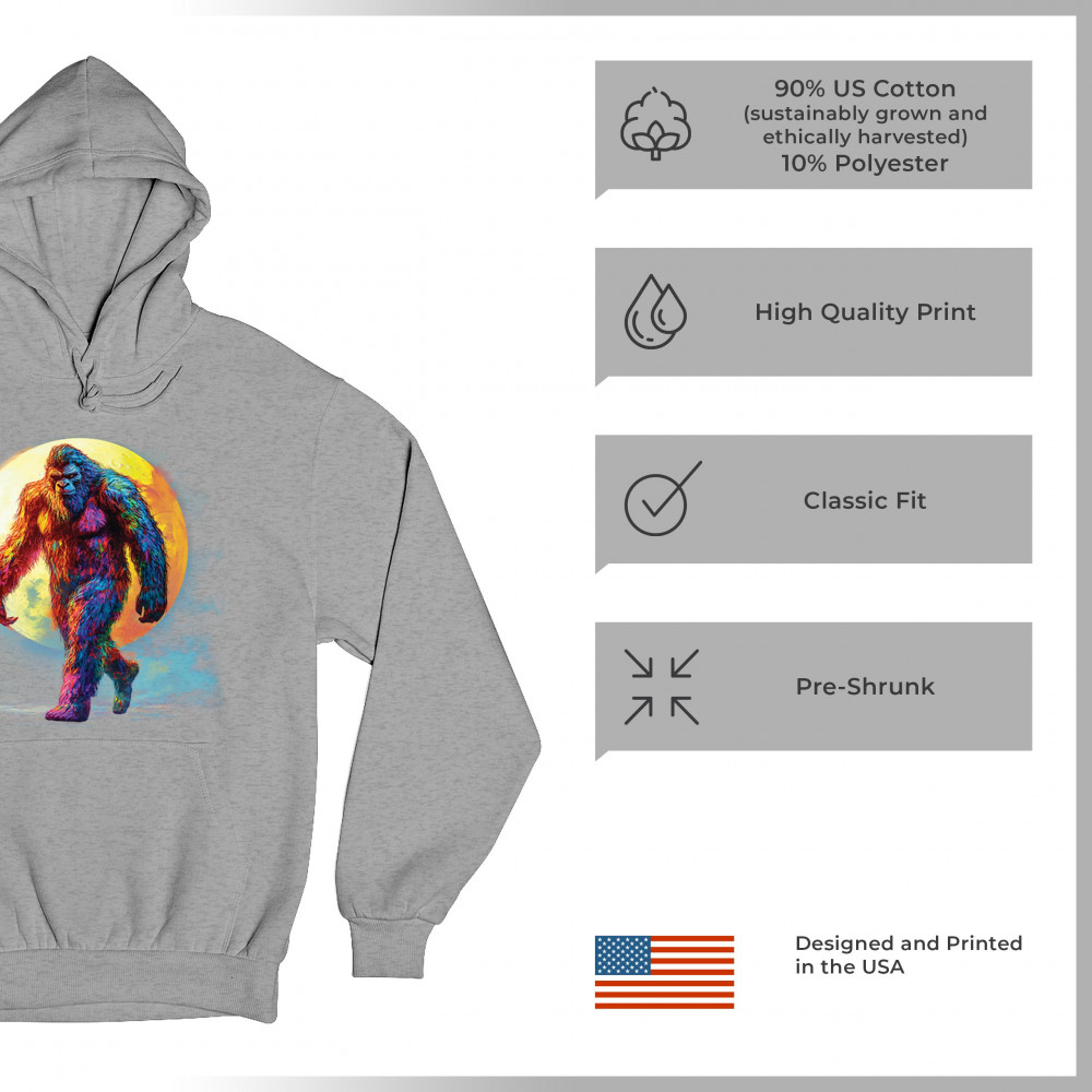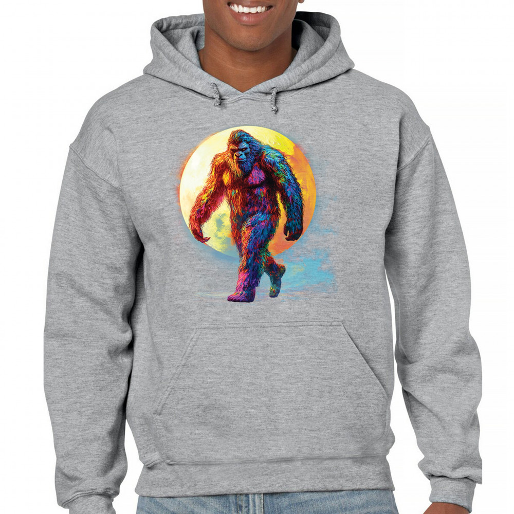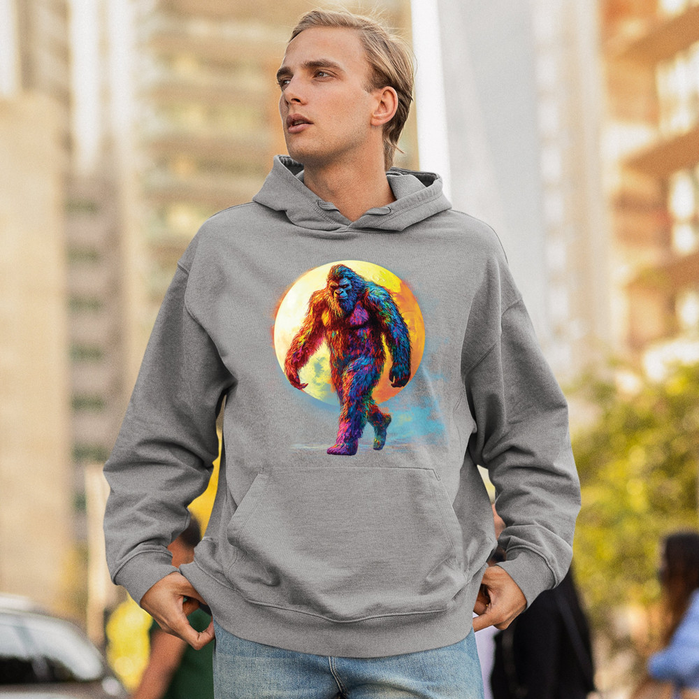 Rainbow Bigfoot under full moon design for cryptid lovers, festival goers, and psychedelic art fans. Bold, surreal, and eye-catching.