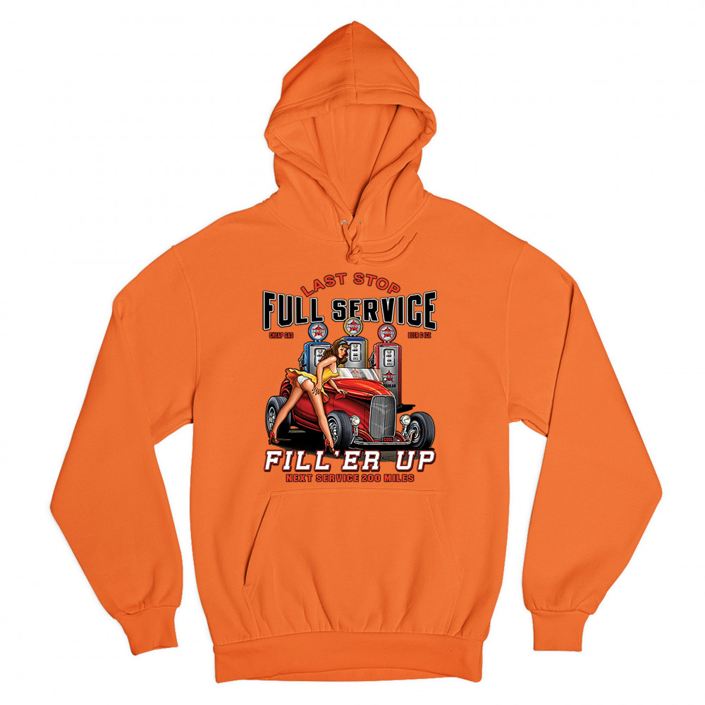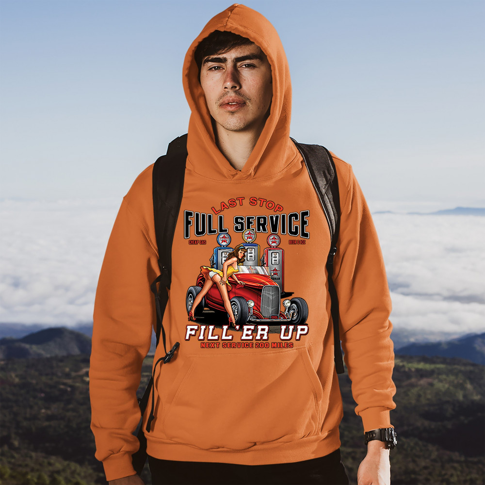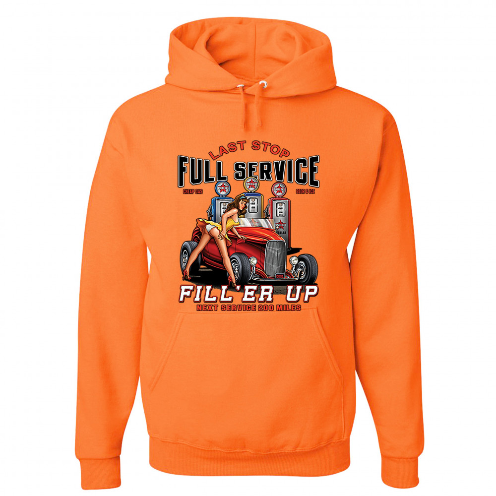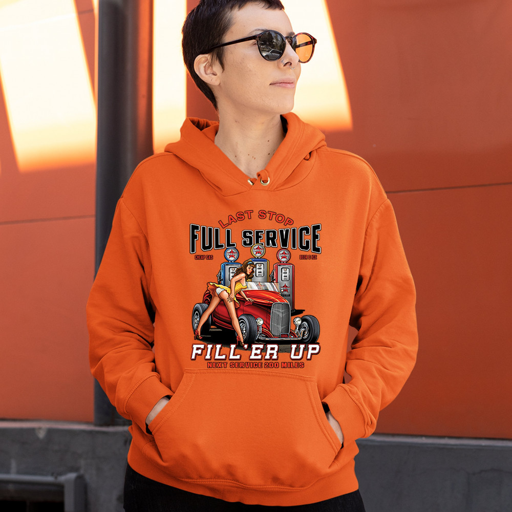 A print featuring a hot pin-up girl leaning on a convertible coupe hot rod with a registration plate saying "cool". In the background there are several gas stations. The print says: "Last Stop, Full Service, Cheap Gas, Beer & Ice, Fill 'Er Up, Next Servic