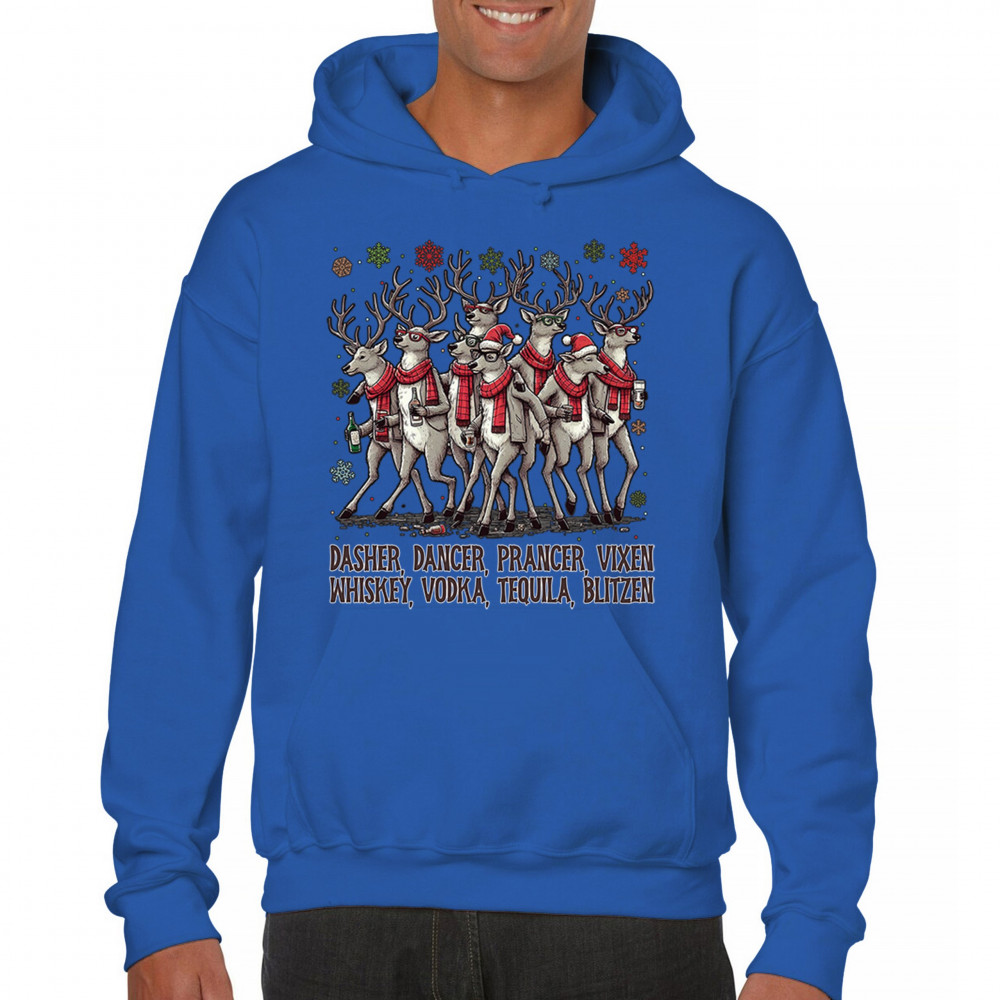 Funny drinking-reindeer Christmas design perfect for parties, bar crawls, and festive adult humor. Great for holiday laughs and spirited winter fun.