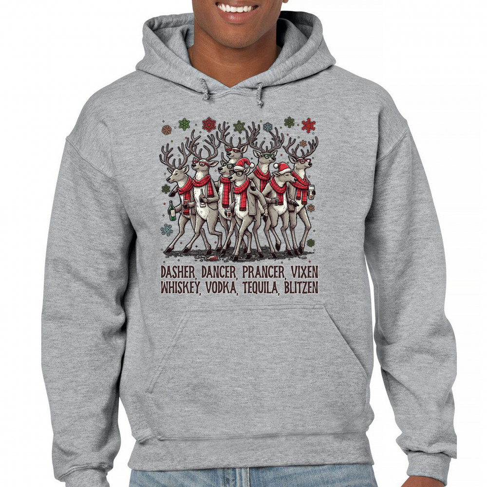 Funny drinking-reindeer Christmas design perfect for parties, bar crawls, and festive adult humor. Great for holiday laughs and spirited winter fun.