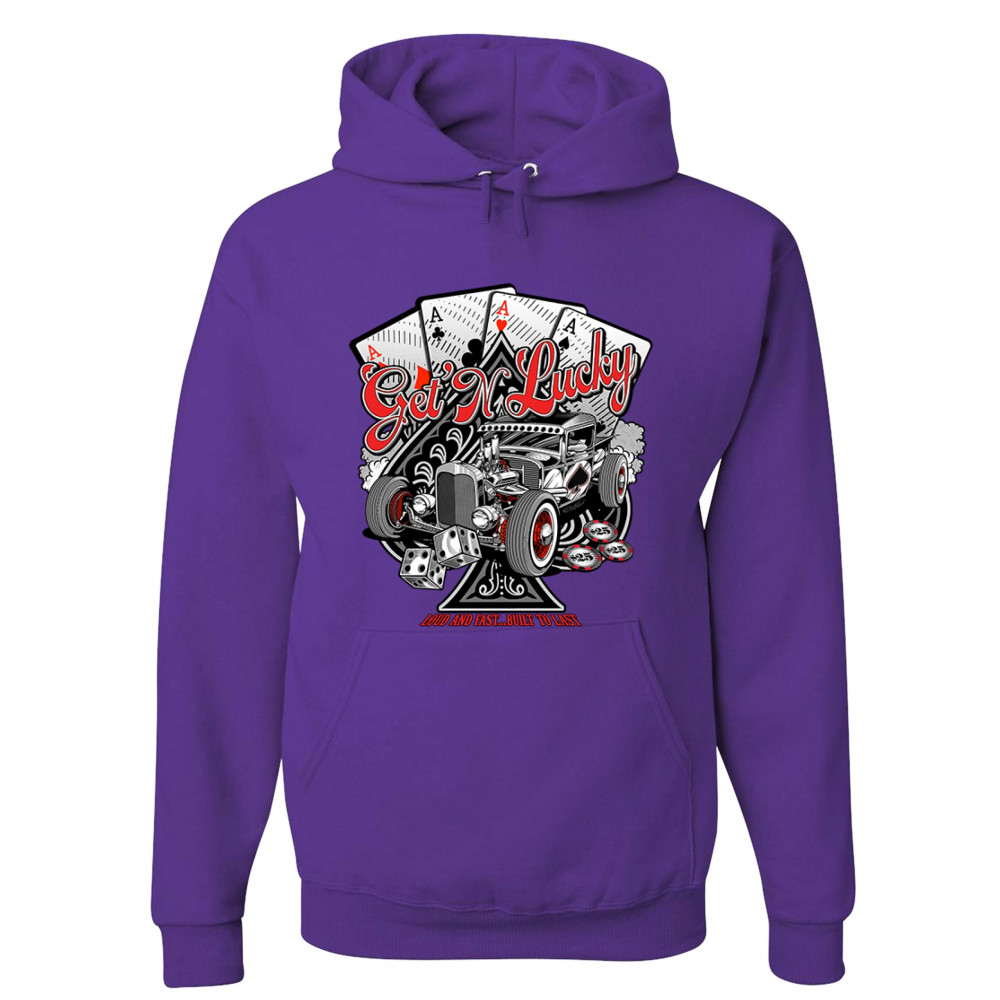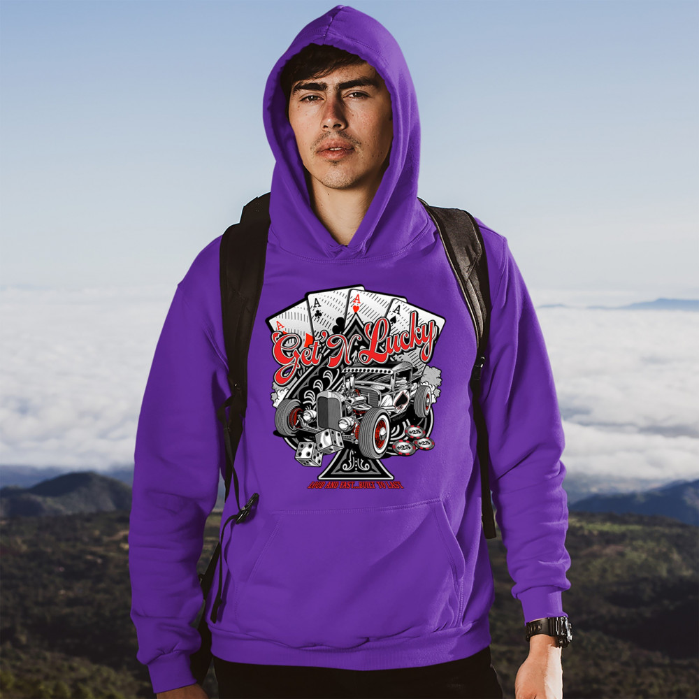 A print featuring a hot rod and a giant ace of spades behind it. In the background there are four aces of every suit. In front of the car there are 2 dices and several casino chips. The print says: "Get'n lucky, louad and fast… built to last". A great cho