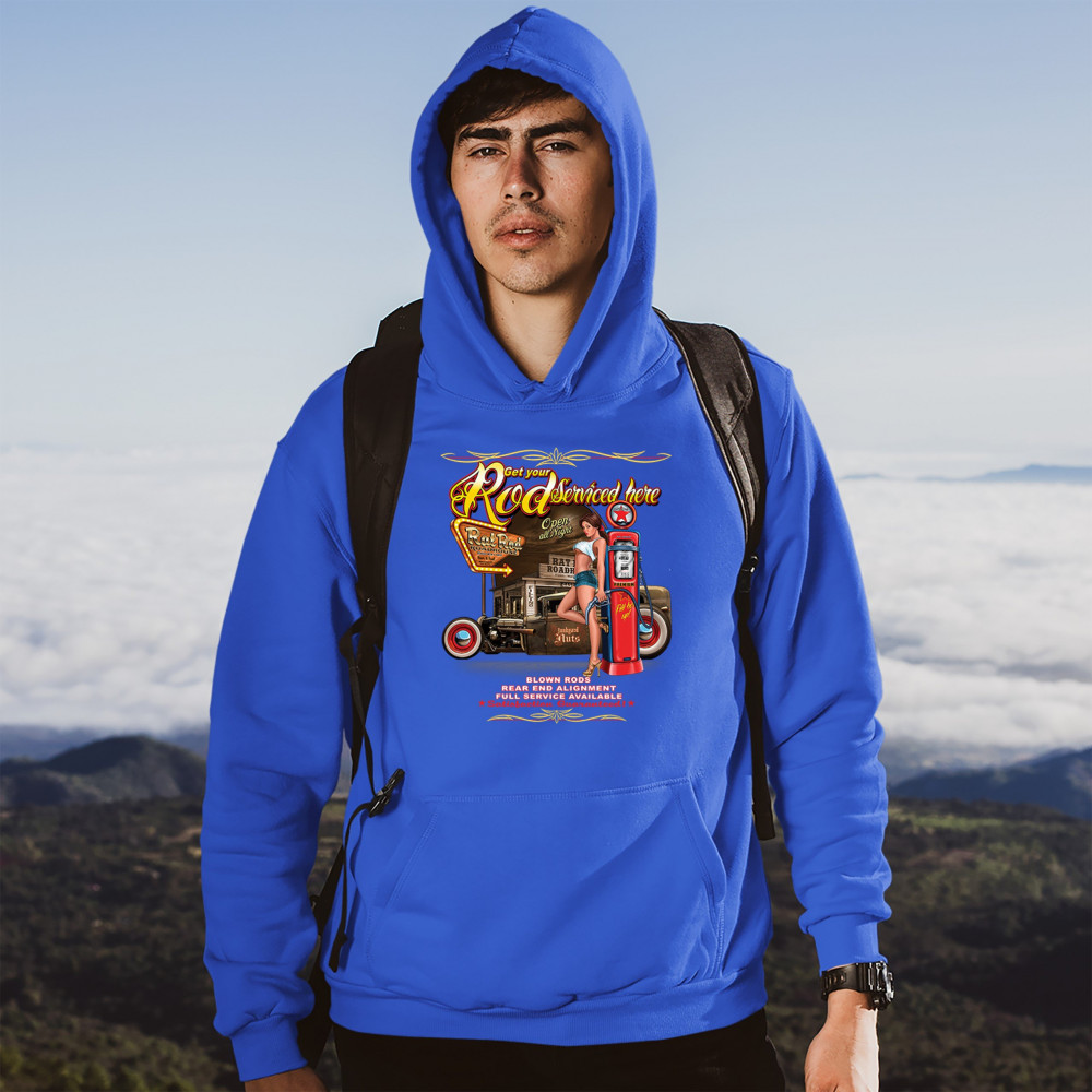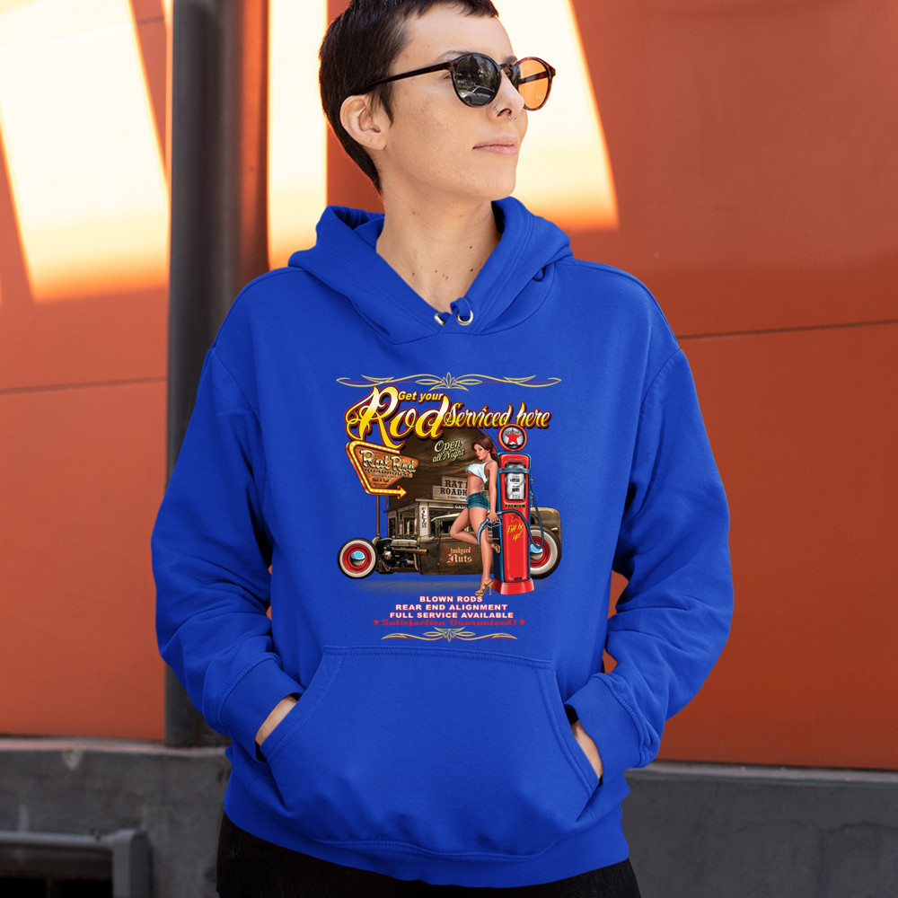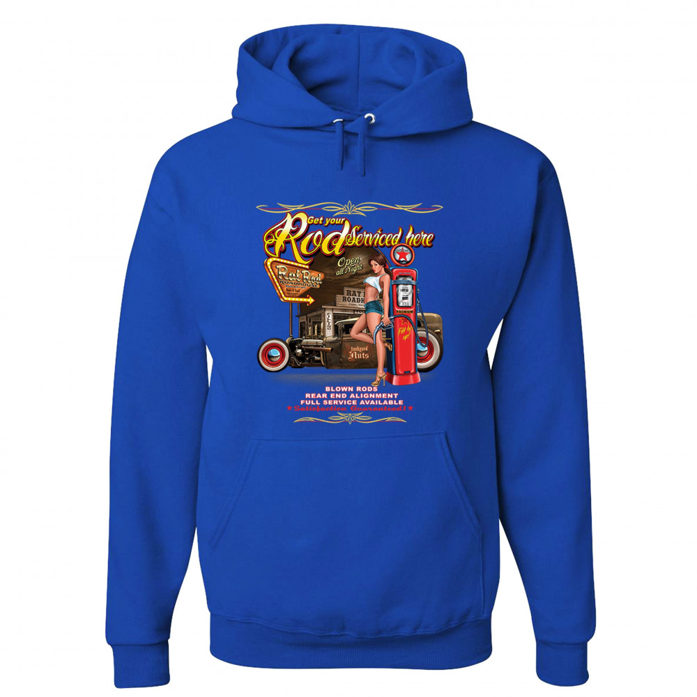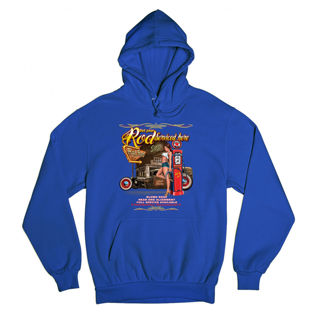 GET YOUR ROD SERVICES HERE sweatshirt route 66 hot rod pin-up girl hoodie royal blue