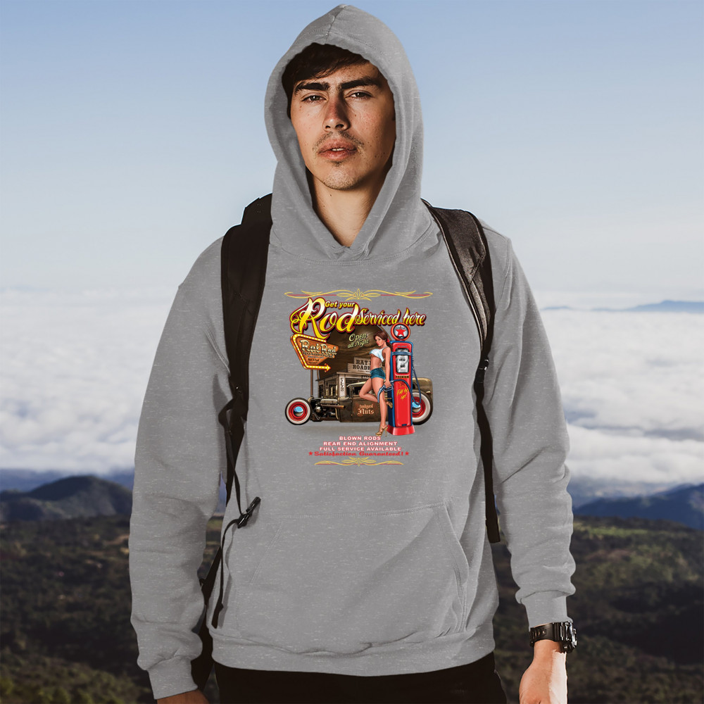 A print featuring a sexy pin-up girl leaning on a gas pump. There is a hot rod behind her and a "Rat Rod Roudhouse" in the background. The print also includes a bunch of innuendos: "get your rod serviced here, blown rods, rear end alignment, full service