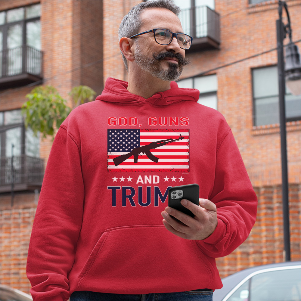A political print saying "God, Guns and Trump". In the center there is the American flag with a silhouette of AK-47 rifle on it. A great choice to wear for a Trump rally or give as a gift to a Donald Trump and Mike Pence supporter before 2020 presidential elections.