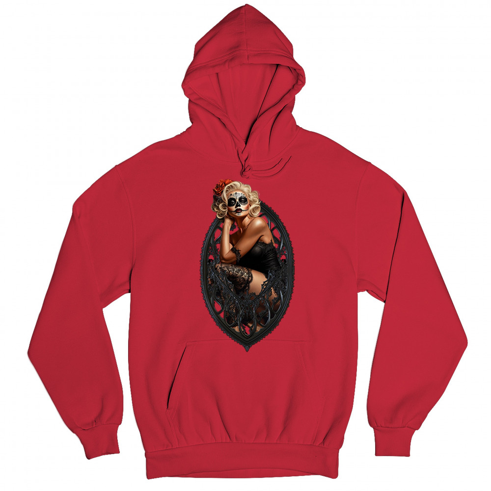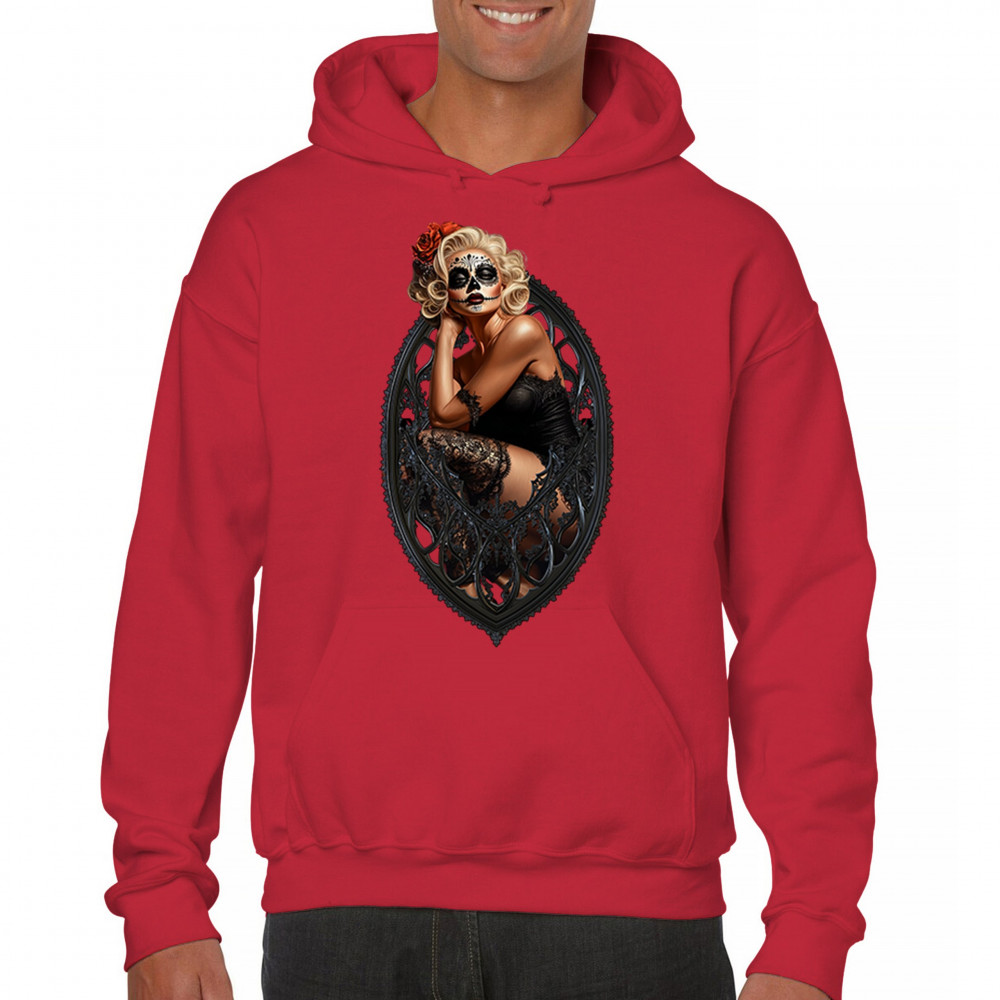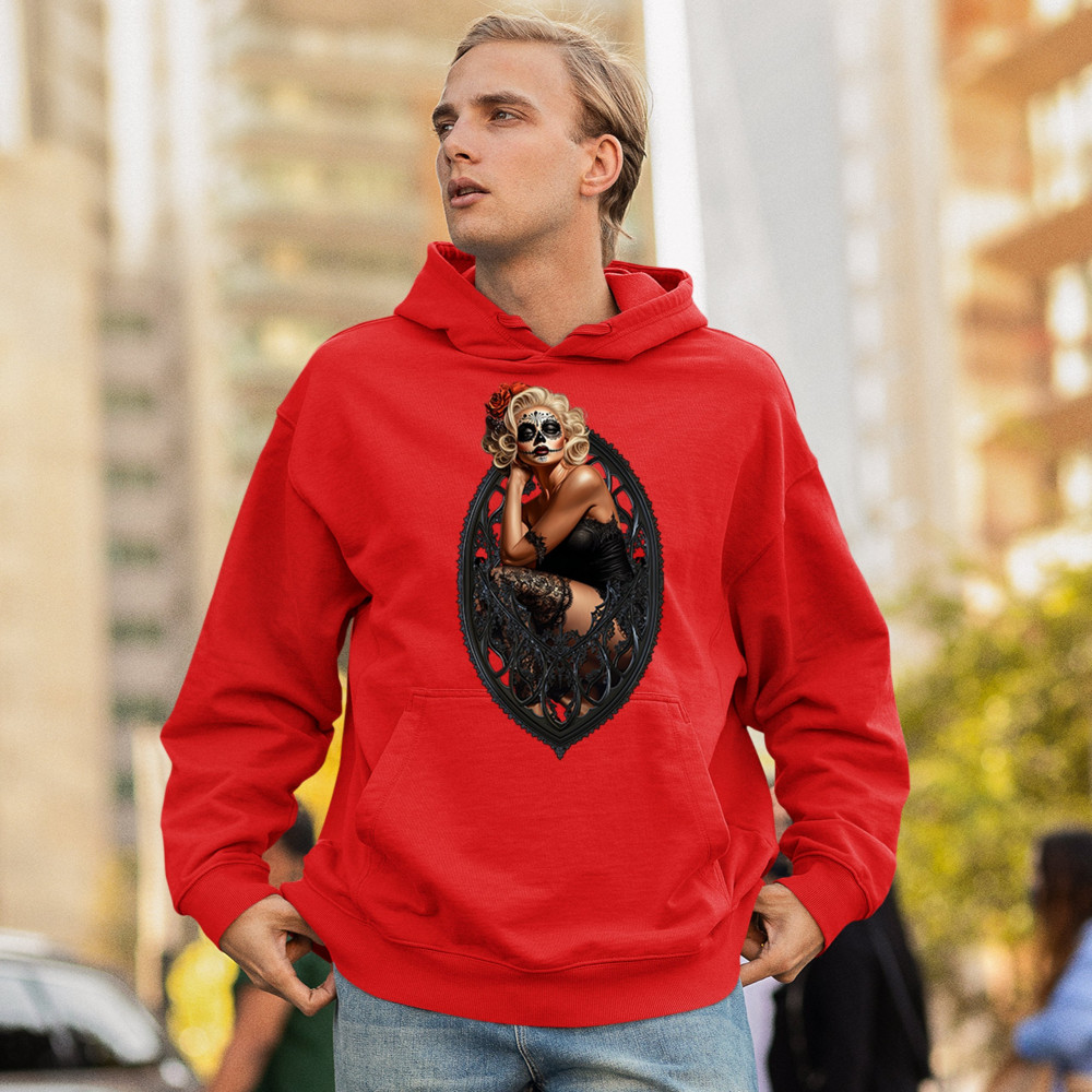 This sultry sugar skull pinup design blends gothic lace, seductive pose, and ornate frame detail for a bold Day of the Dead tribute. With striking makeup and vintage lingerie styling, it’s perfect for fans of macabre fashion, calavera art, and dark romance. A hauntingly beautiful mix of allure, attitude, and Dia de los Muertos charm.