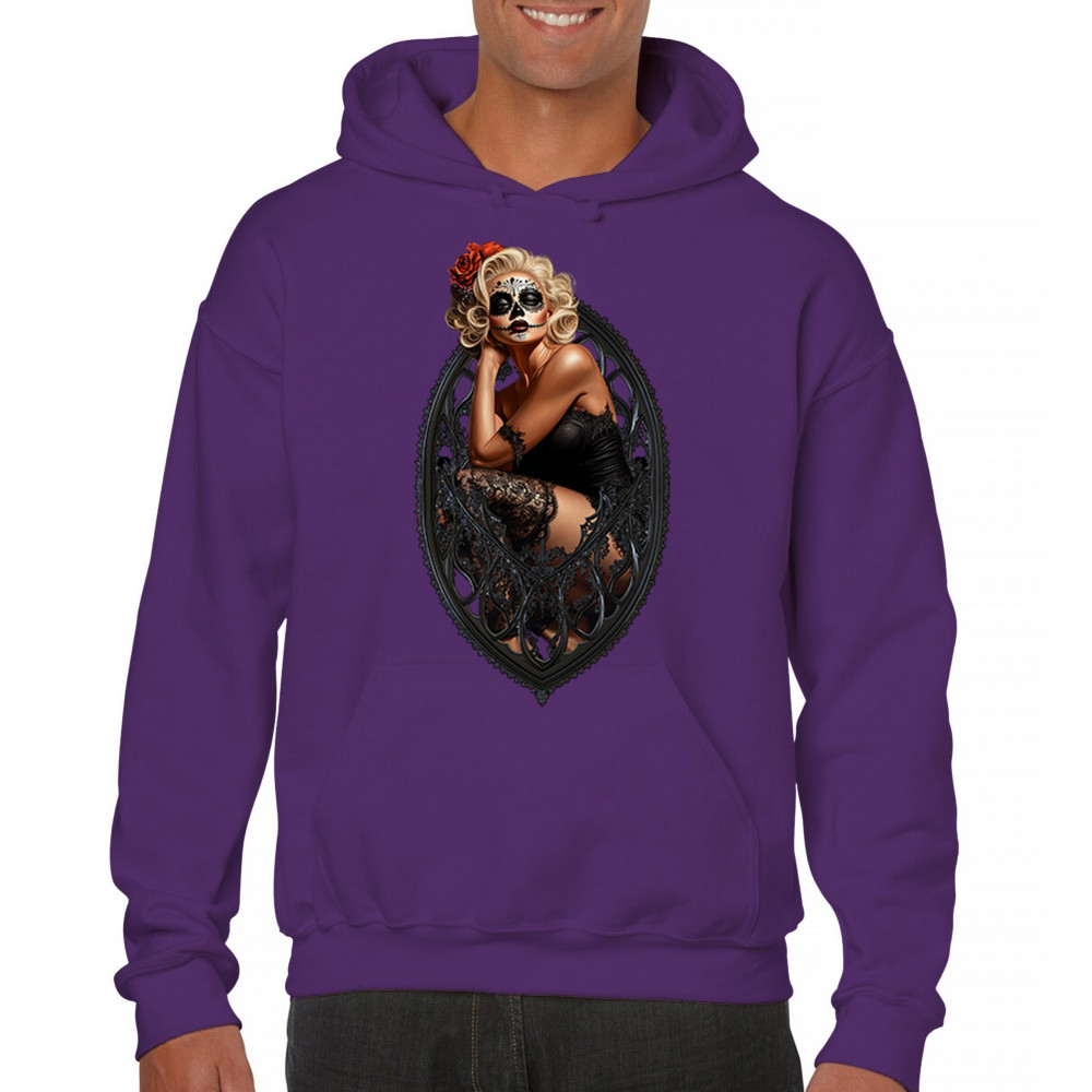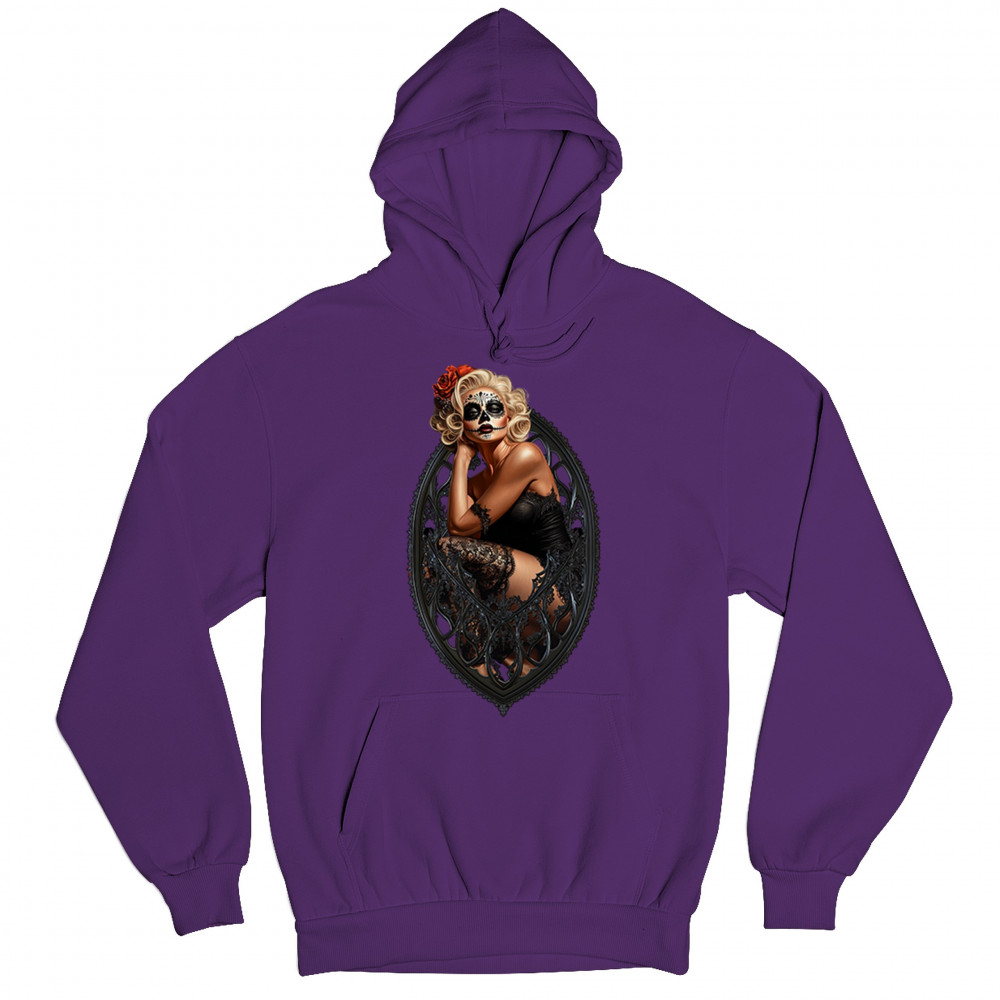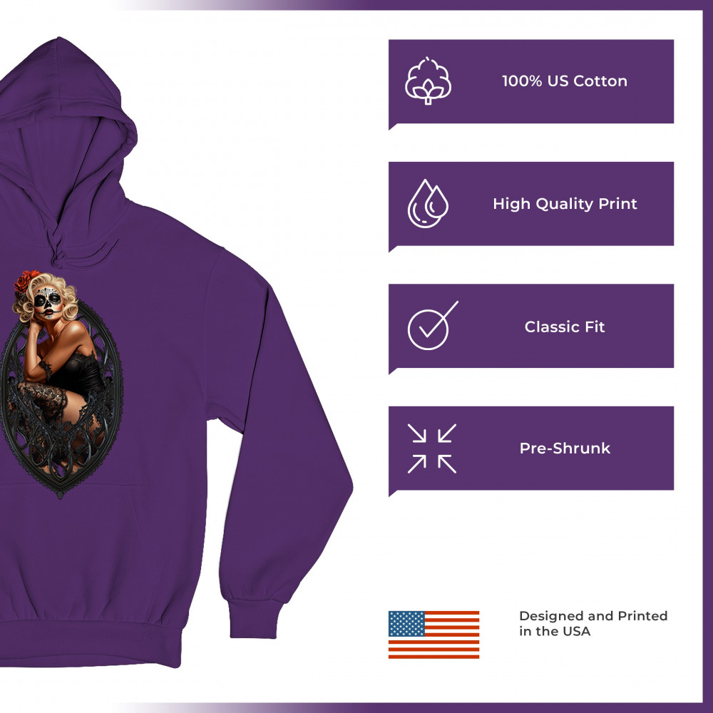 This sultry sugar skull pinup design blends gothic lace, seductive pose, and ornate frame detail for a bold Day of the Dead tribute. With striking makeup and vintage lingerie styling, it’s perfect for fans of macabre fashion, calavera art, and dark romance. A hauntingly beautiful mix of allure, attitude, and Dia de los Muertos charm.