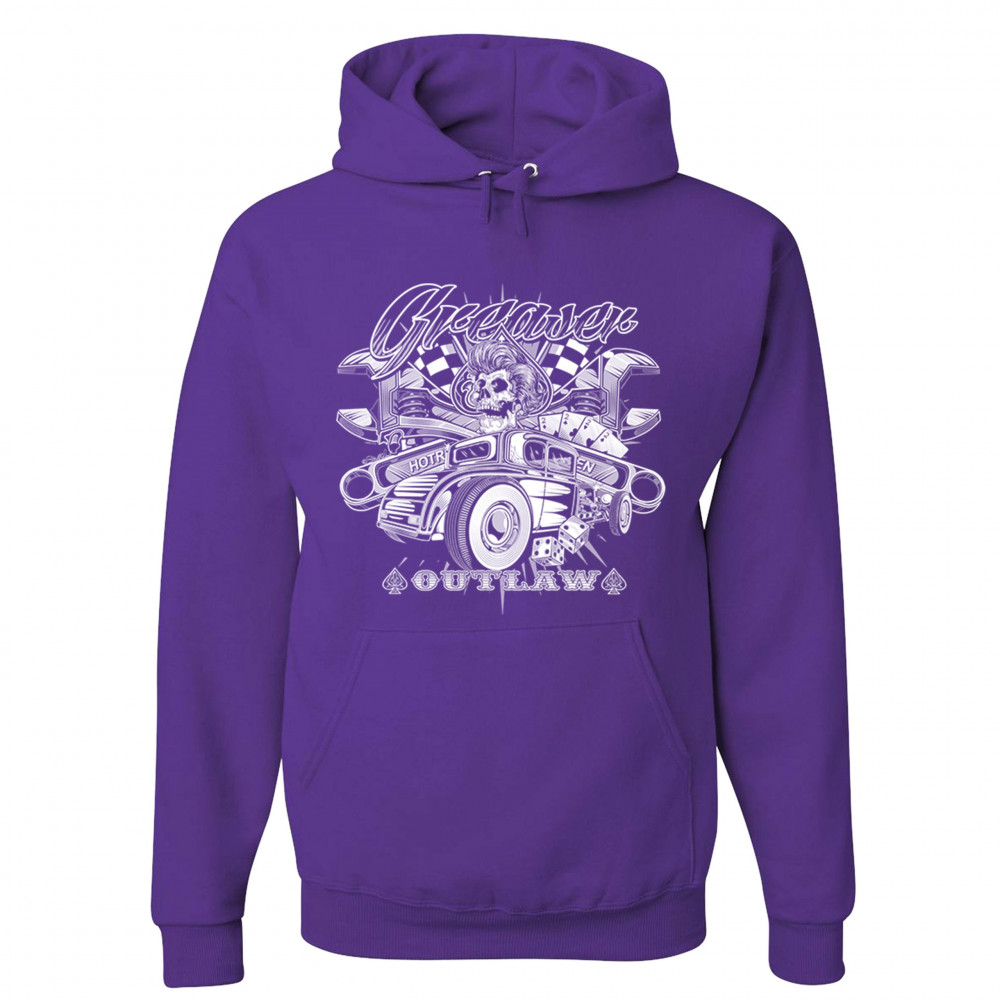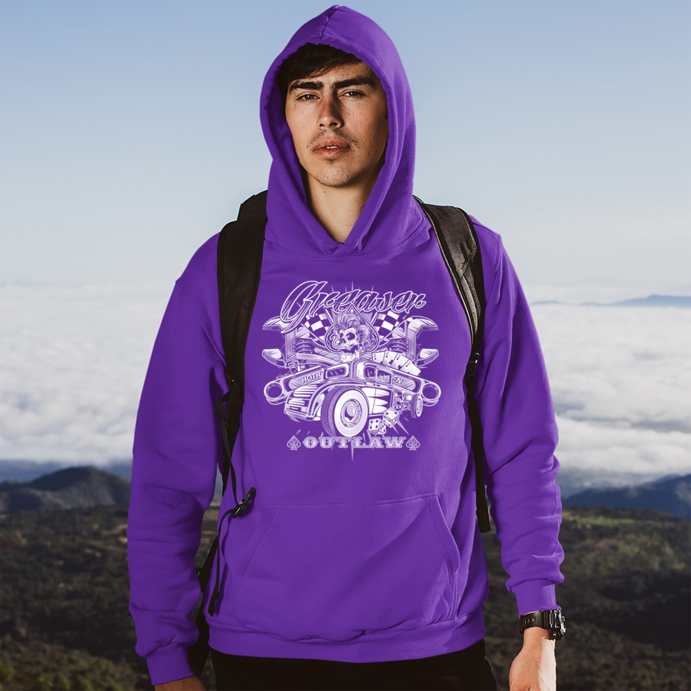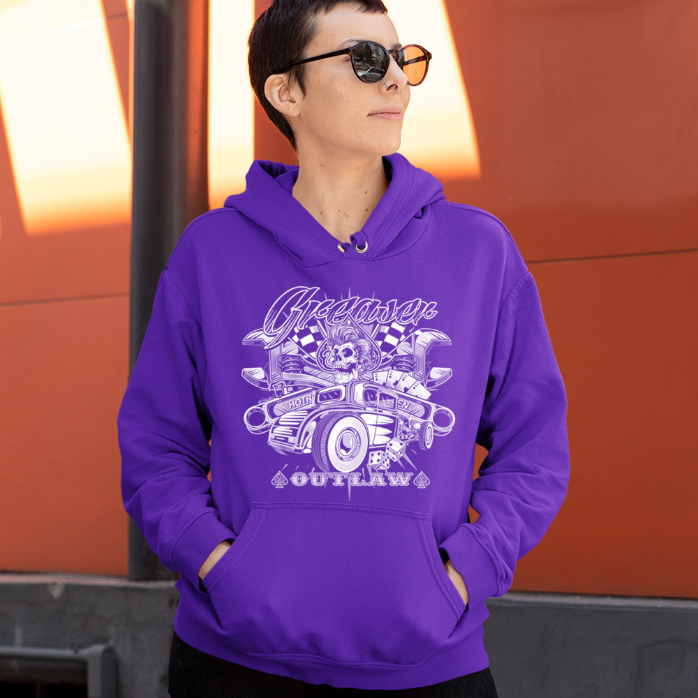 A print featuring a skull, a vintage Hot Rod and a pair of dice. In the background there are crossed wrenches, playing cards and racing flags. The print says: "Greaser outlaw". A great choice for a fan of customized American classic cars and hot rods.