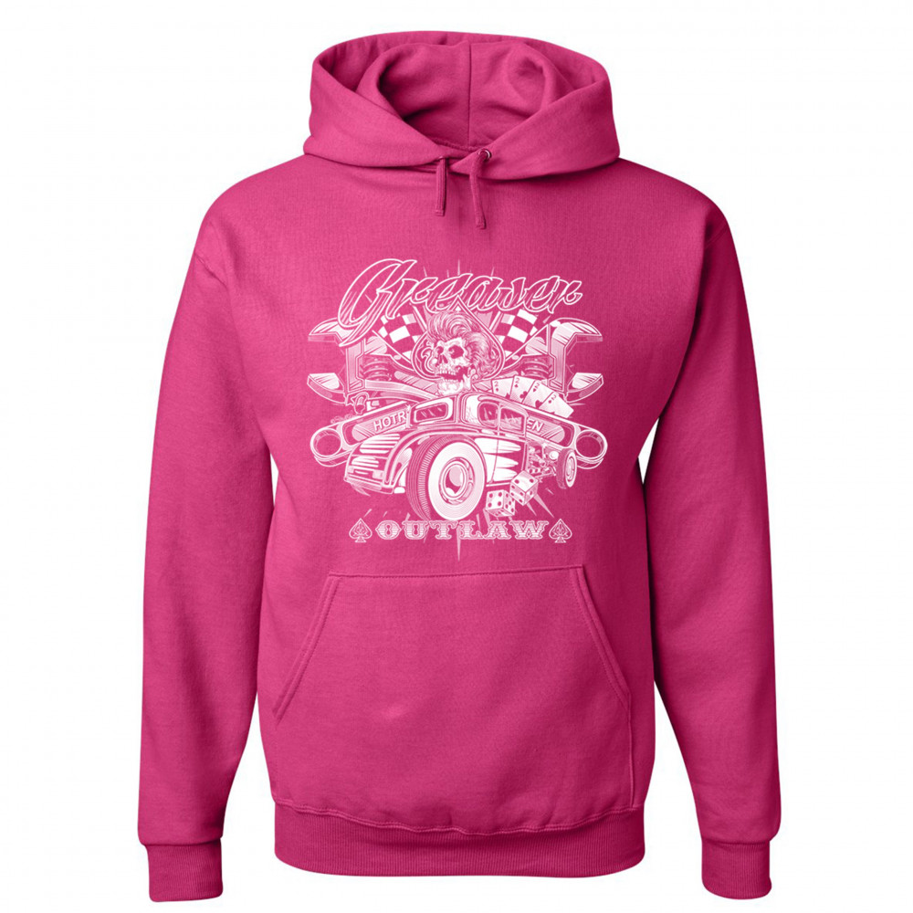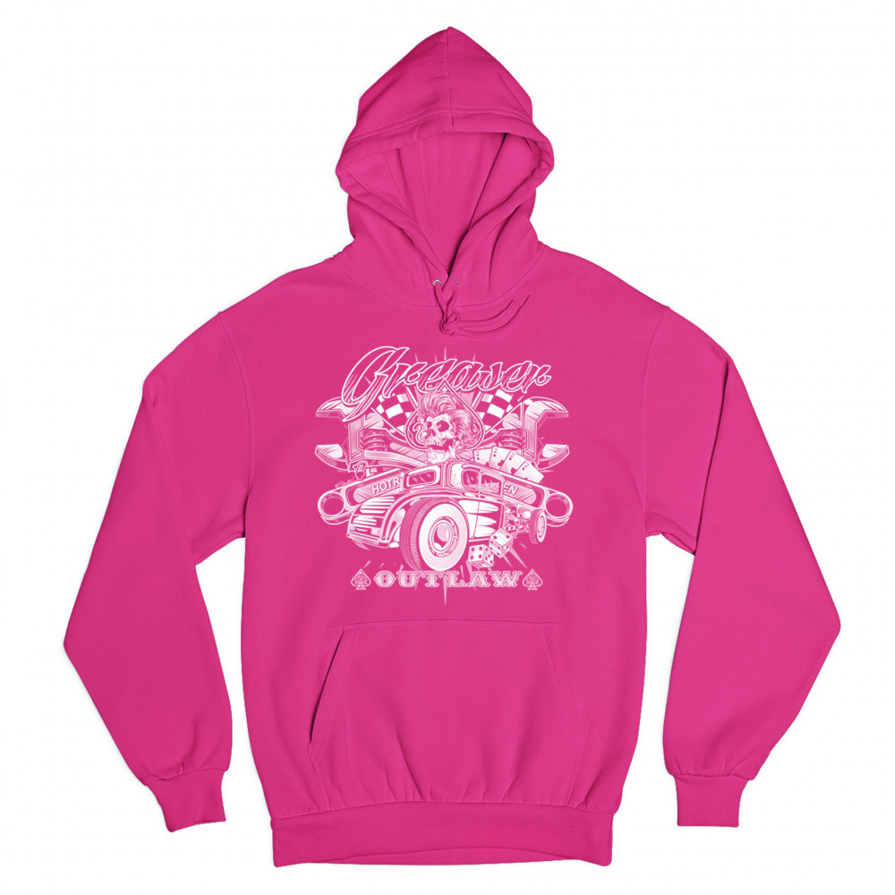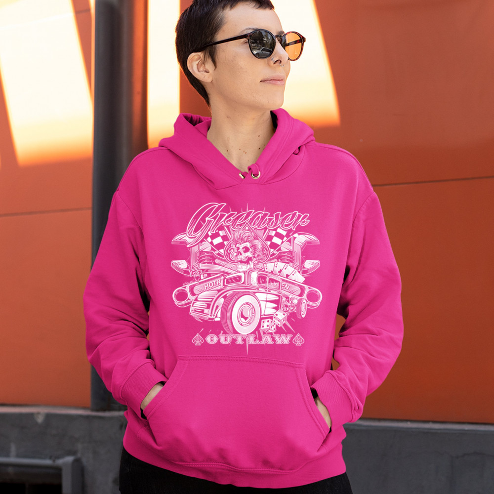 A print featuring a skull, a vintage Hot Rod and a pair of dice. In the background there are crossed wrenches, playing cards and racing flags. The print says: "Greaser outlaw". A great choice for a fan of customized American classic cars and hot rods.