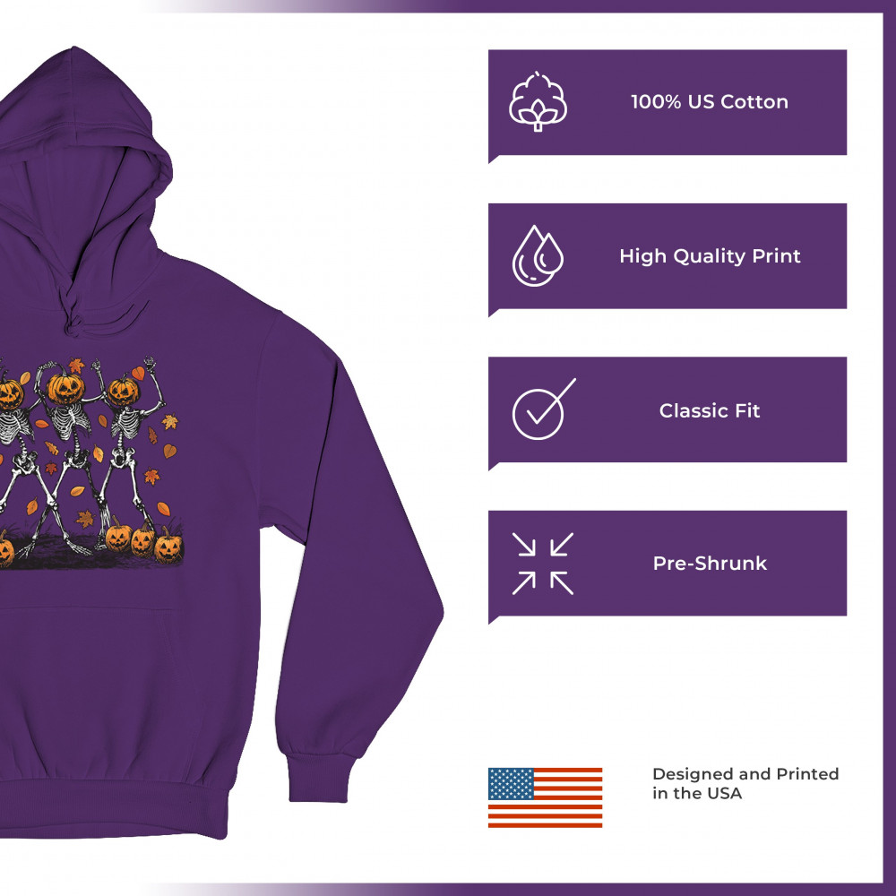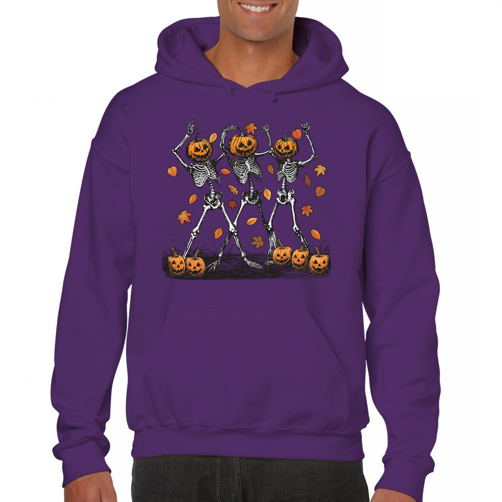 Add a touch of spooky fun to your wardrobe with this lively design featuring pumpkin-headed skeletons dancing through a swirl of autumn leaves. Perfect for Halloween parties, trick-or-treating, and fall festivals, this design is a must-have for anyone who enjoys the whimsical side of the spooky season. Made with comfort and quality in mind, this is the perfect apparel for all your October gatherings and events. Wear it to show off your Halloween spirit!