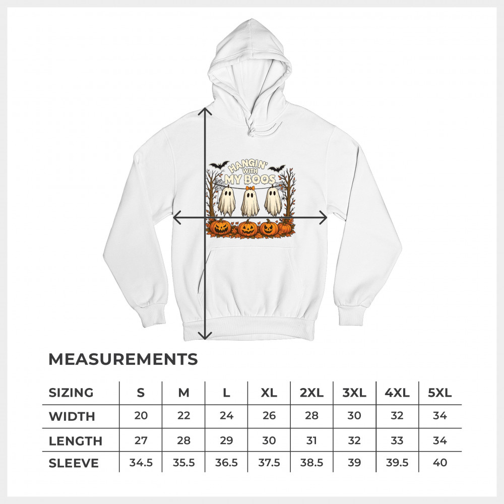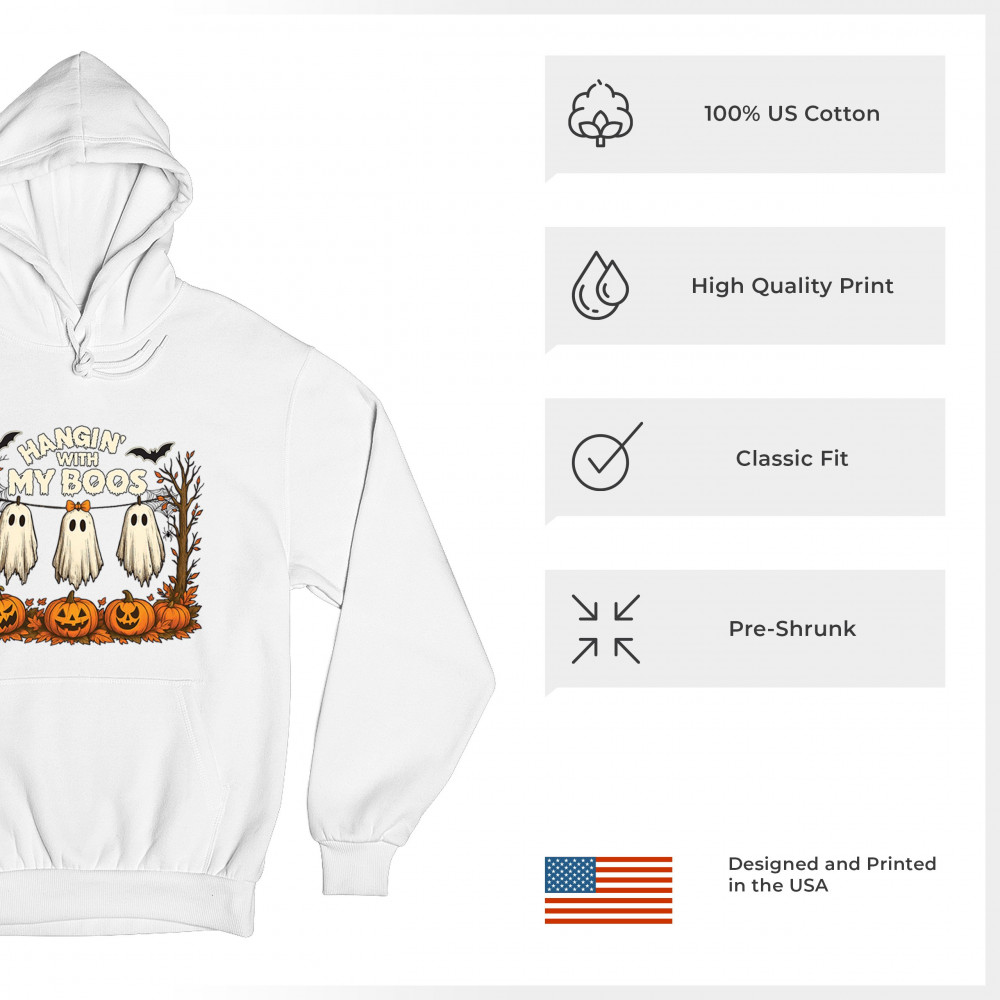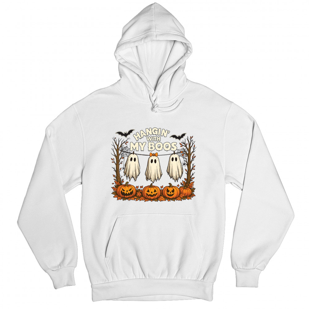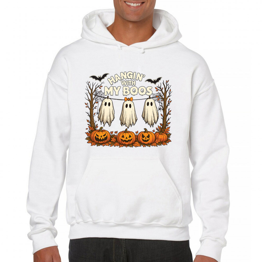 Hangin With My Boos design featuring spooky ghosts, jack o lanterns, and haunted house humor. Perfect for Halloween night, October 31, and parties.