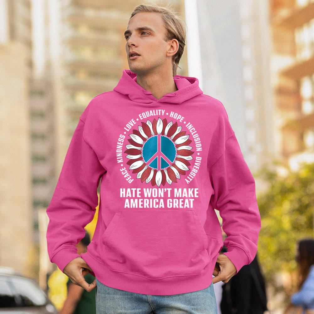 Embrace the message of love, equality, and unity with this eye-catching design. The sunflower and peace symbol represent a commitment to kindness and inclusion, rejecting hate and division. Perfect for those who support liberal values, this design is a bold statement against negativity and for a brighter future. Wear it proudly to show your belief in a diverse, united America. Let this design be a symbol of hope and progress for all.