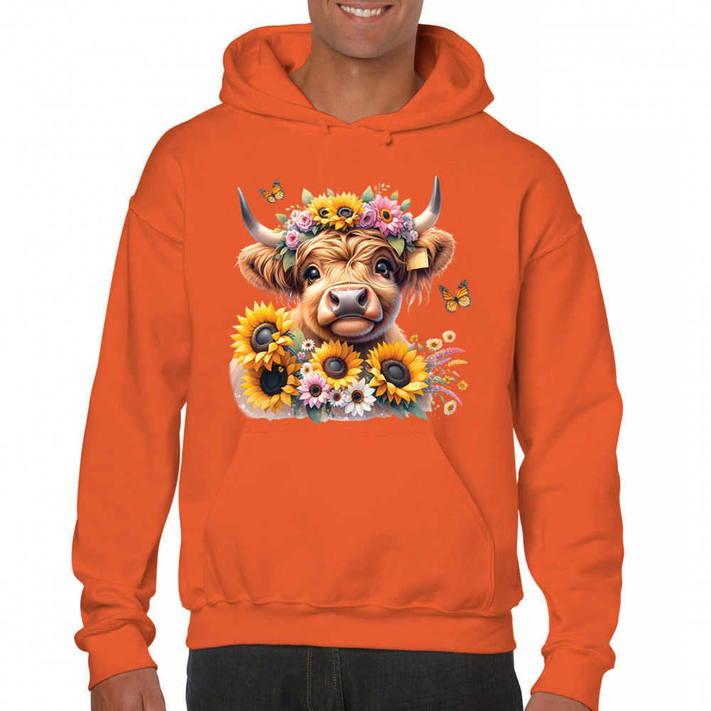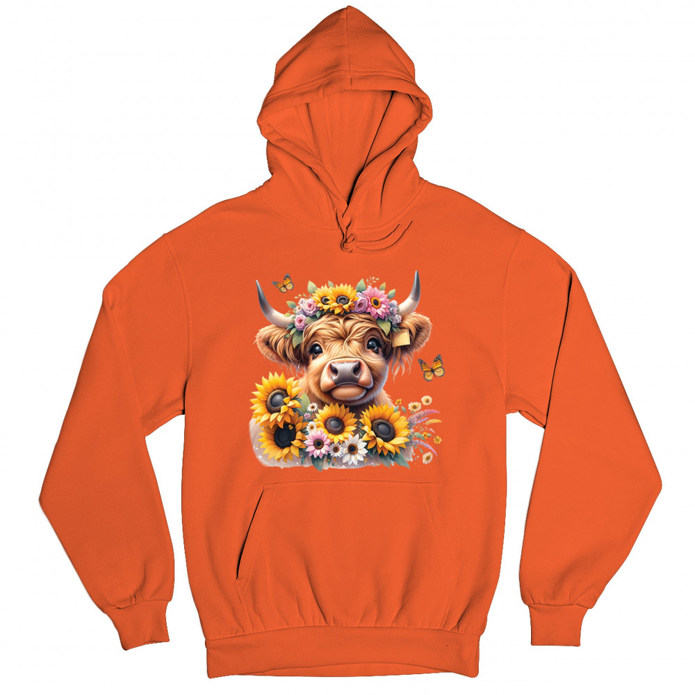 Highland Cow floral design with sunflowers and daisies, rustic farmhouse cow style, western ranch boho charm, and cozy country farmhouse shirt vibes.