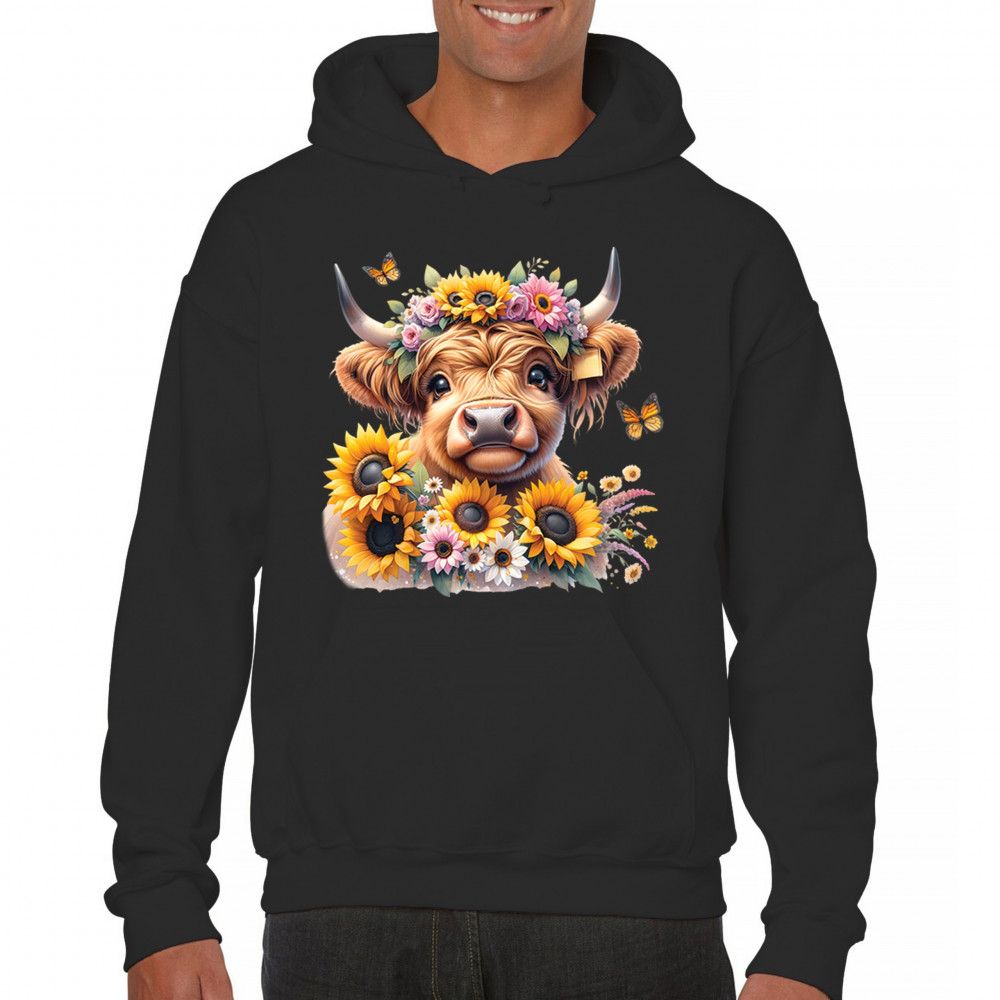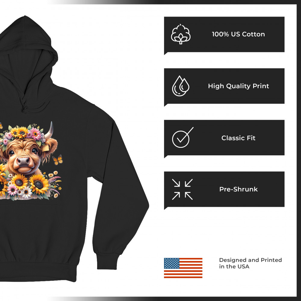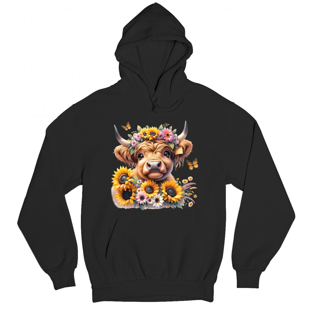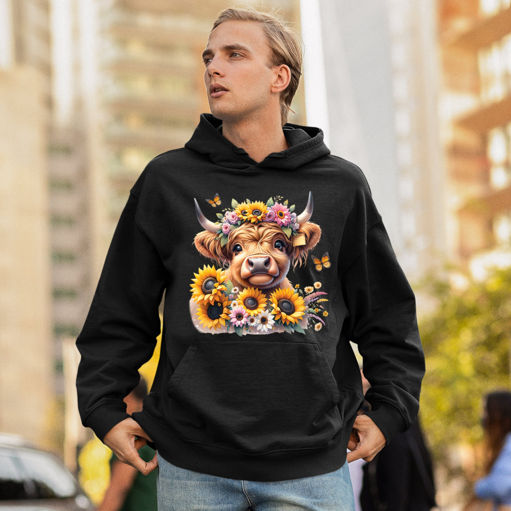 Highland Cow floral design with sunflowers and daisies, rustic farmhouse cow style, western ranch boho charm, and cozy country farmhouse shirt vibes.