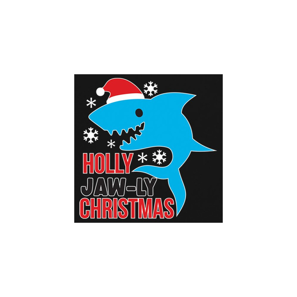 Funny Holly Jaw-ly Christmas shark pun design with Santa hat and snowflakes. Perfect for ocean lovers, festive parties, and cheerful holiday fun.