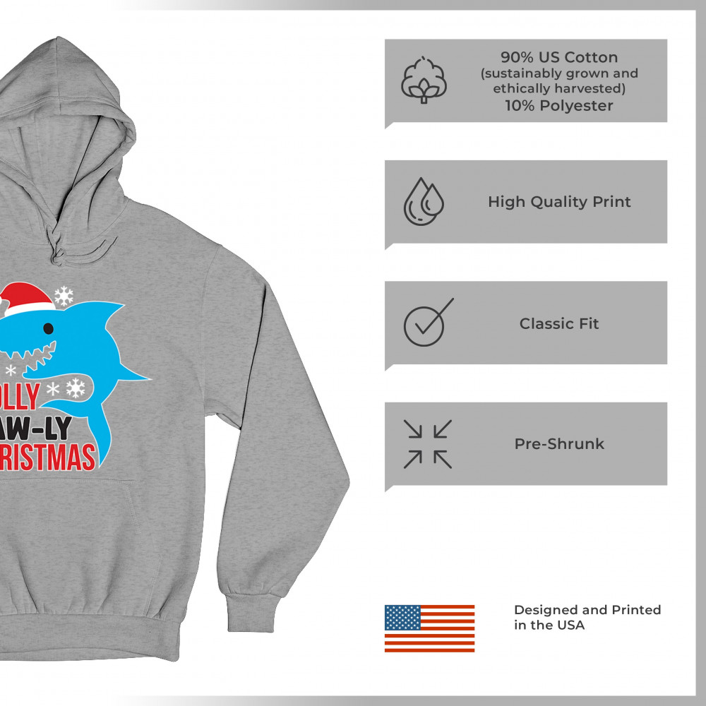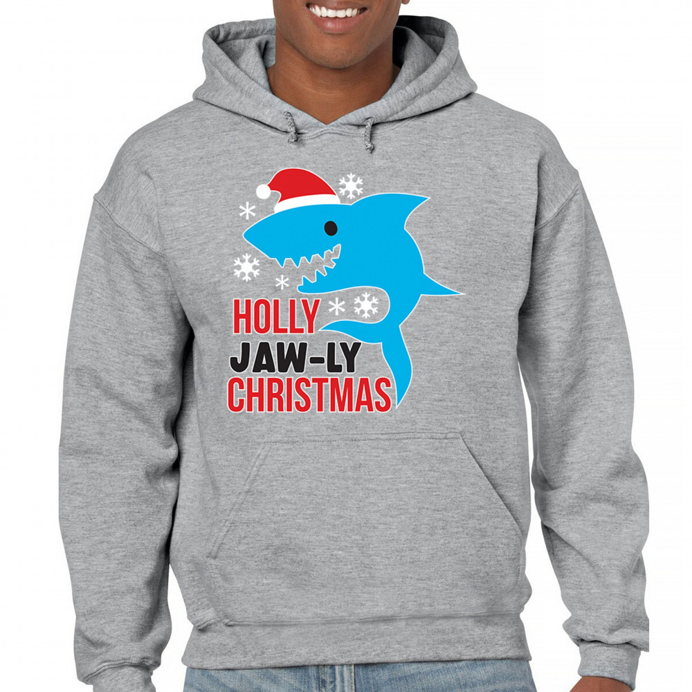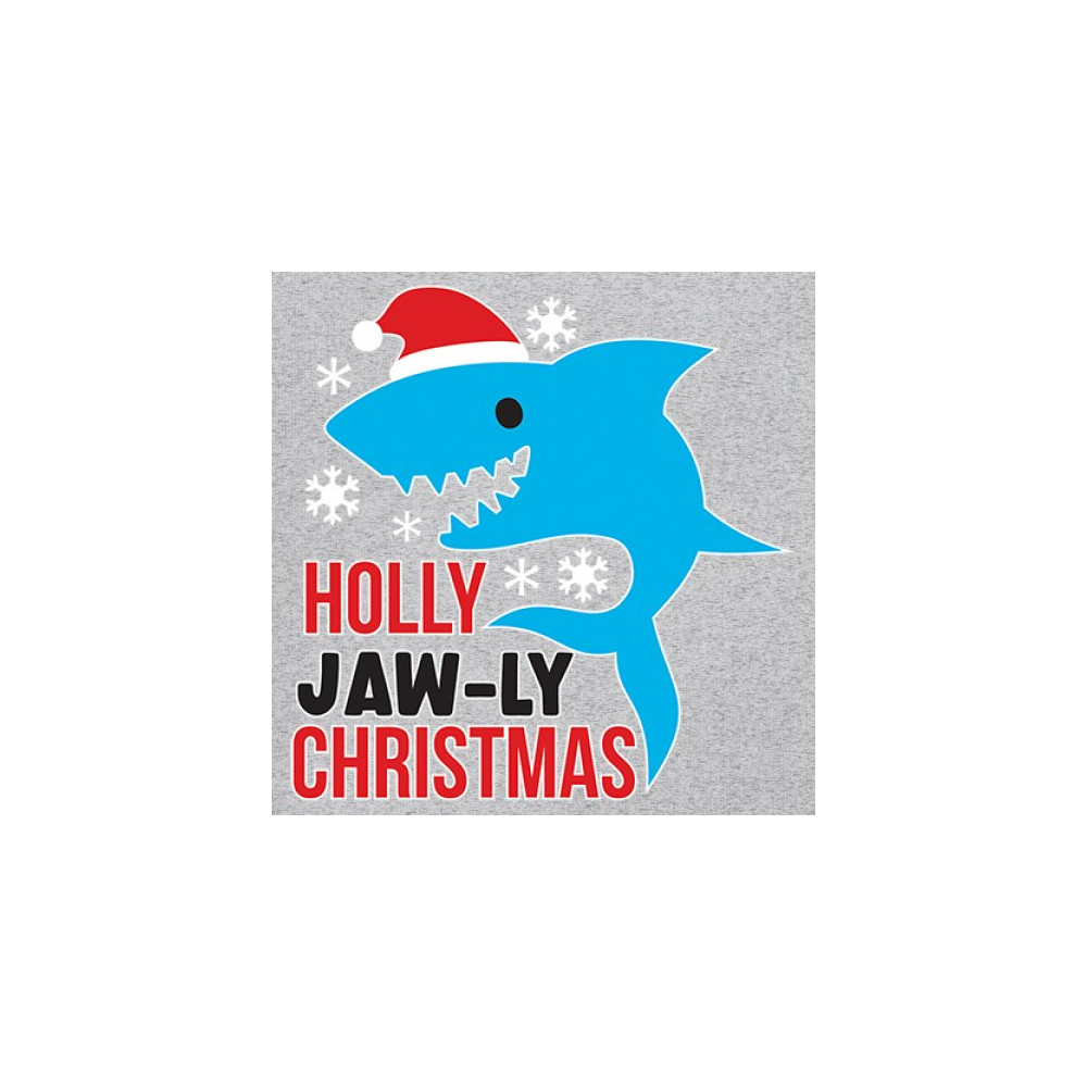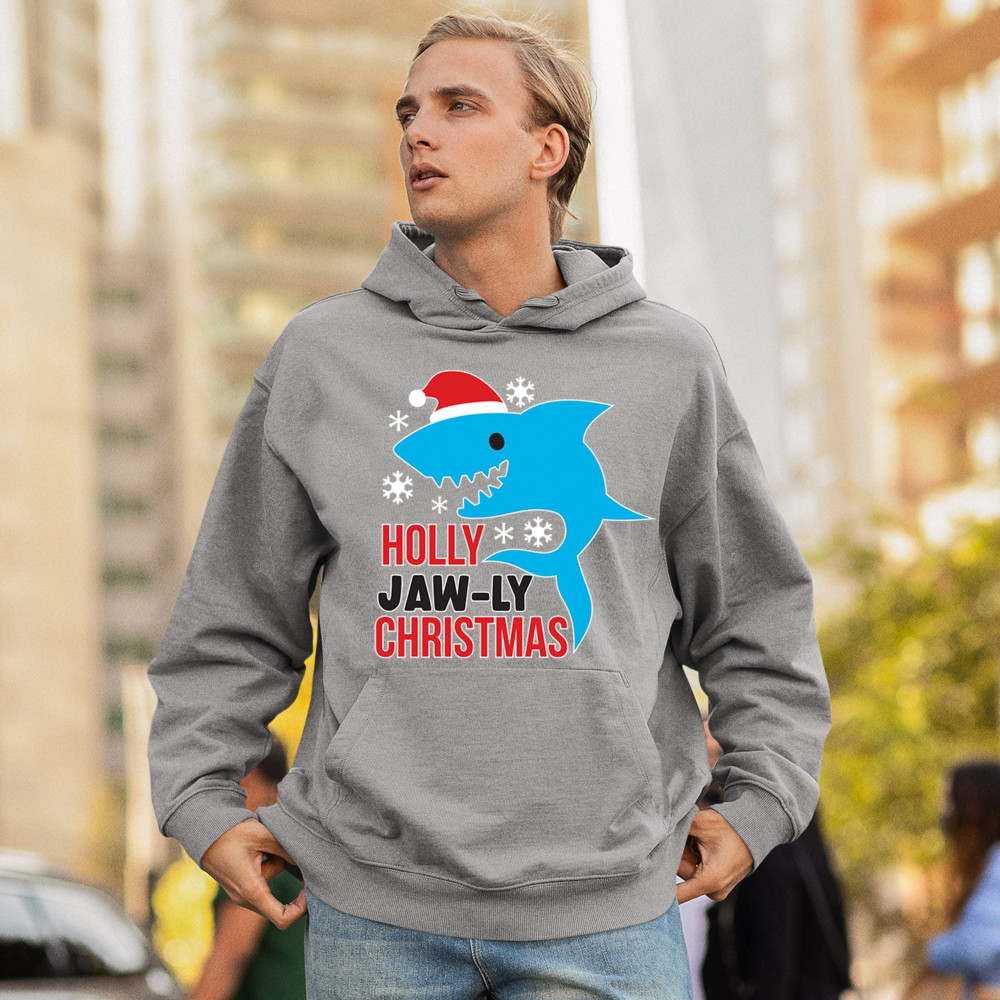 Funny Holly Jaw-ly Christmas shark pun design with Santa hat and snowflakes. Perfect for ocean lovers, festive parties, and cheerful holiday fun.