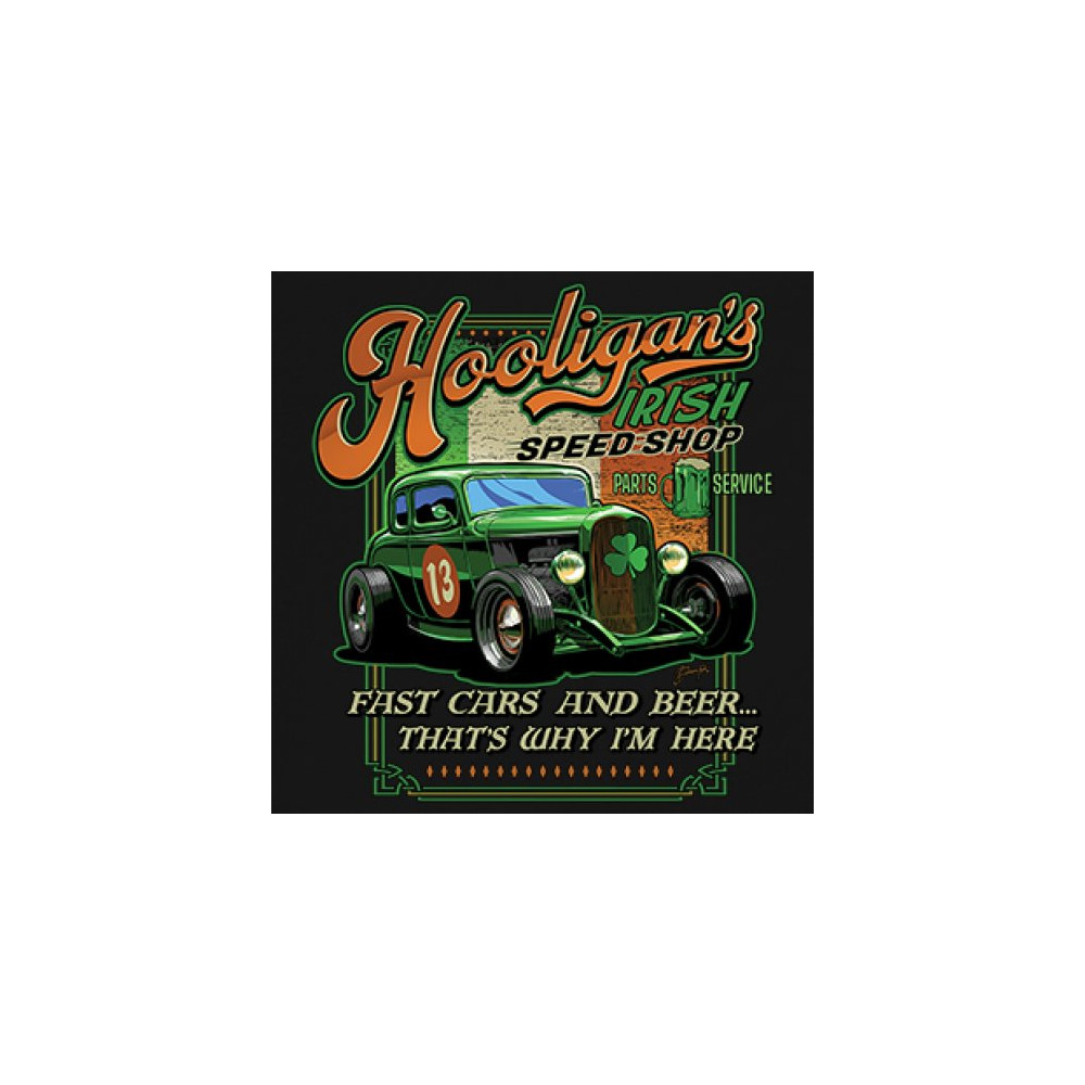 Celebrate St. Patrick's Day in style with the Hooligan Speed Shop T-Shirt, featuring a bold design of the Irish flag perfect for showcasing your pride while adding flair to any festive occasion.