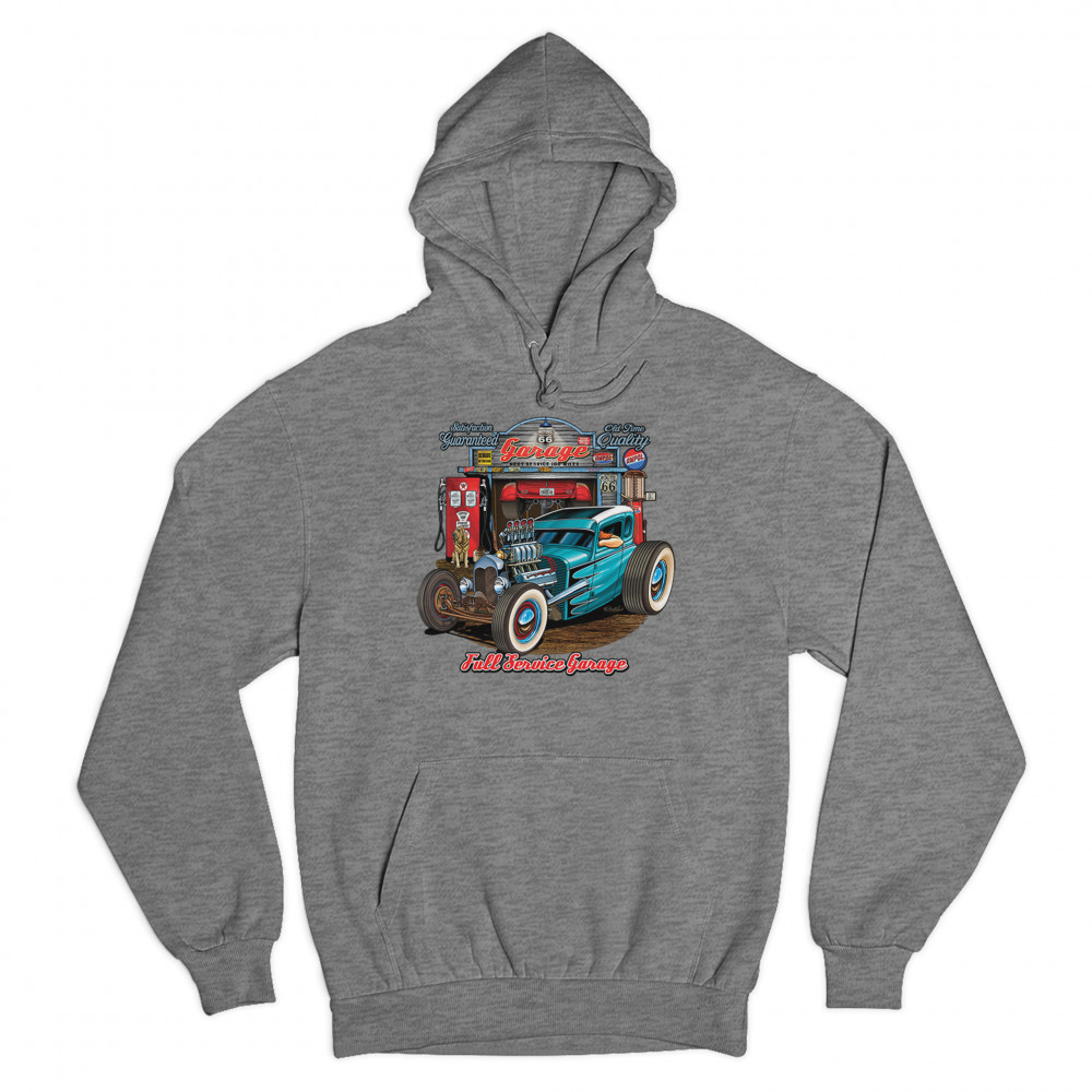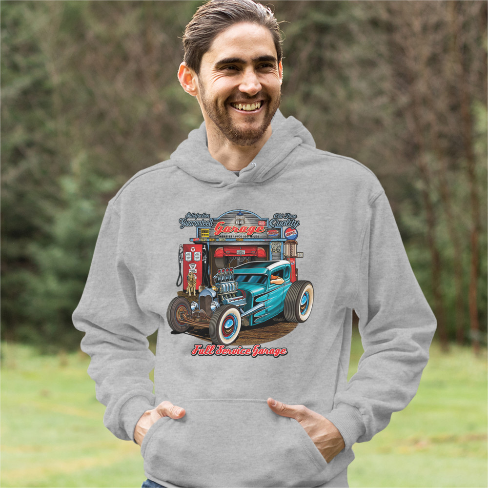 A print featuring a beautiful blue hot rod and a garage behind it. The garage has numerous signs on it which says :"Satisfaction guaranteed", "Old time quality", "Historic Route 66". Under the car it says: "Full service garage". Great for Route 66 and hot rod fans.