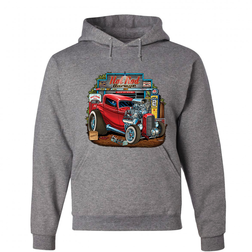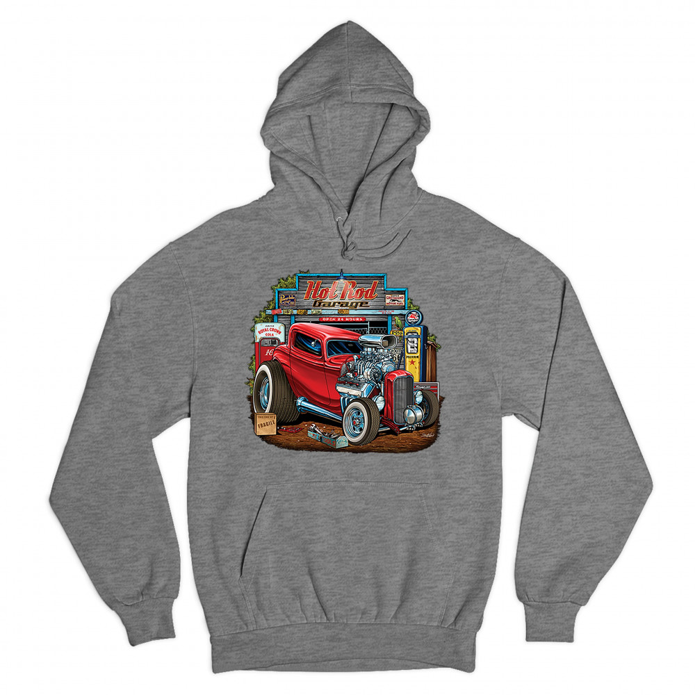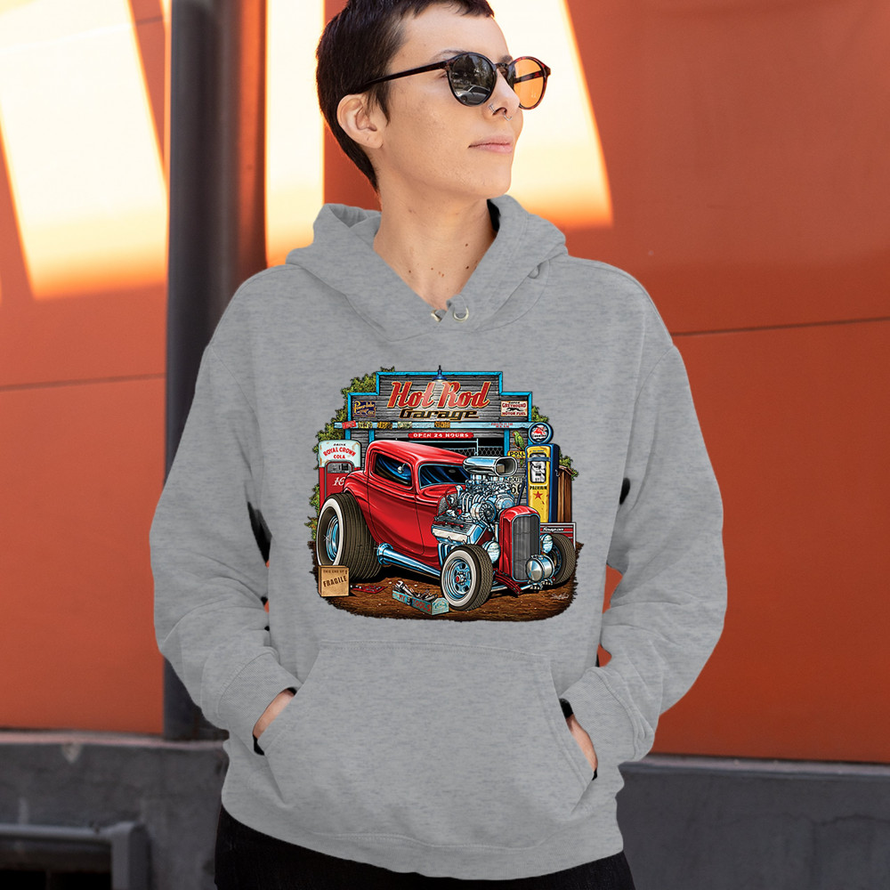 A print featuring a vintage hot rod with an exposed engine and plus-sized rear wheels. In the background there is a garage with a gas station and a sign that says: "Hot Rod Garage". A great choice for a fan of customized American classic cars and hot rods