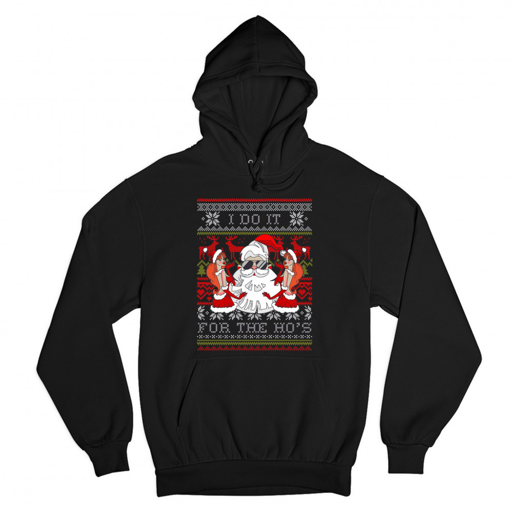 A funny print saying: "I do it for the ho's". It features a badass Santa Claus wearing sunglasses and two sexy girls in revealing Christmas outfits leaning on Santa's beard. The print is decorated wit the ugly sweater pattern in the background. Amazing ch