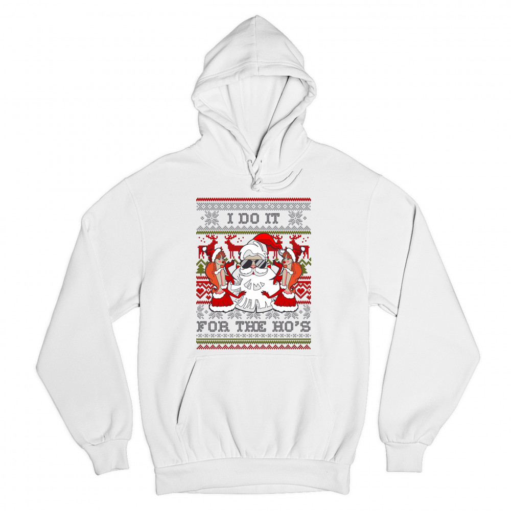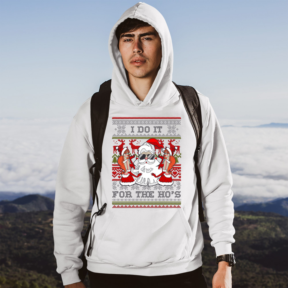 A funny print saying: "I do it for the ho's". It features a badass Santa Claus wearing sunglasses and two sexy girls in revealing Christmas outfits leaning on Santa's beard. The print is decorated wit the ugly sweater pattern in the background. Amazing ch