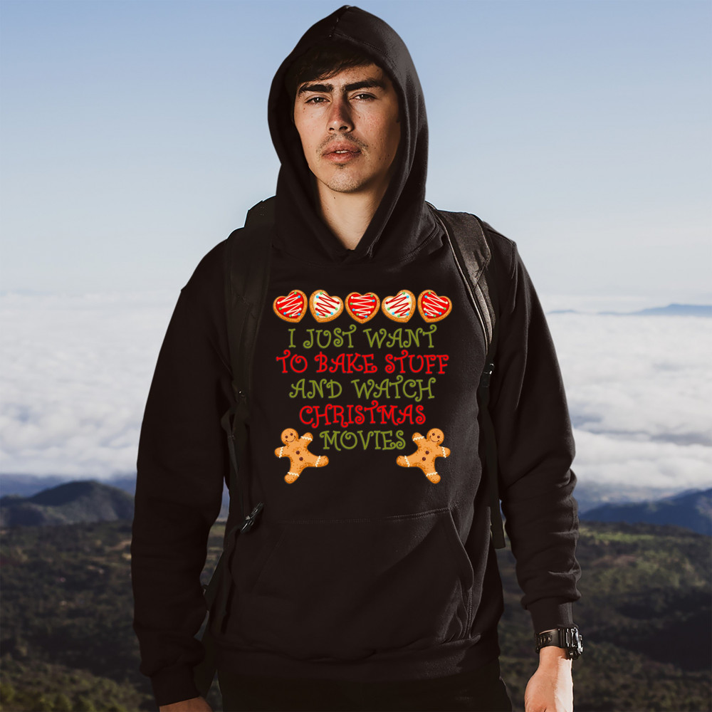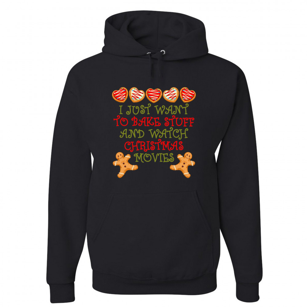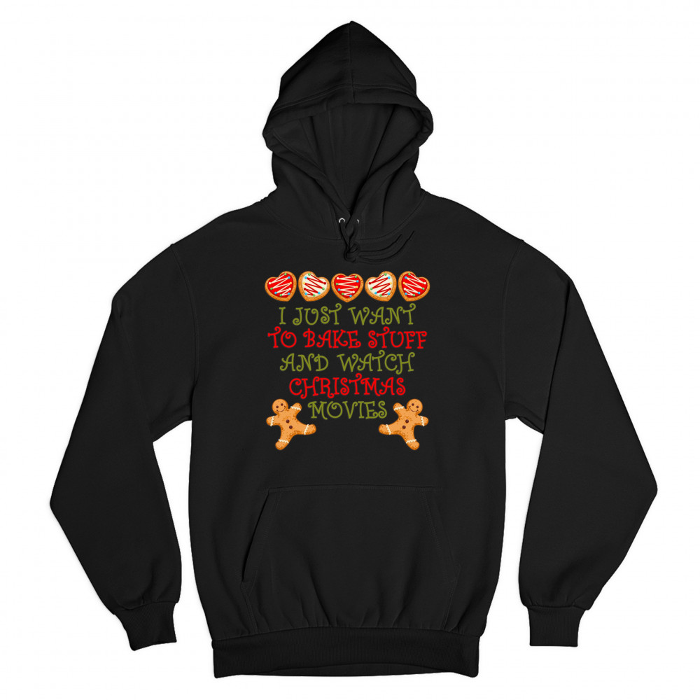 I JUST WANT TO BAKE STUFF AND WATCH CHRISTMAS MOVIES sweatshirt xmas hoodie black
