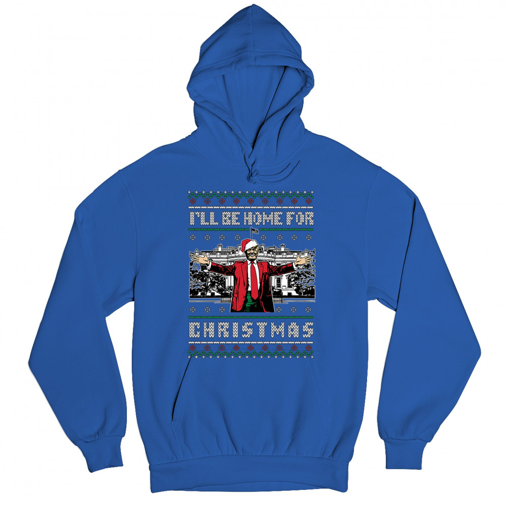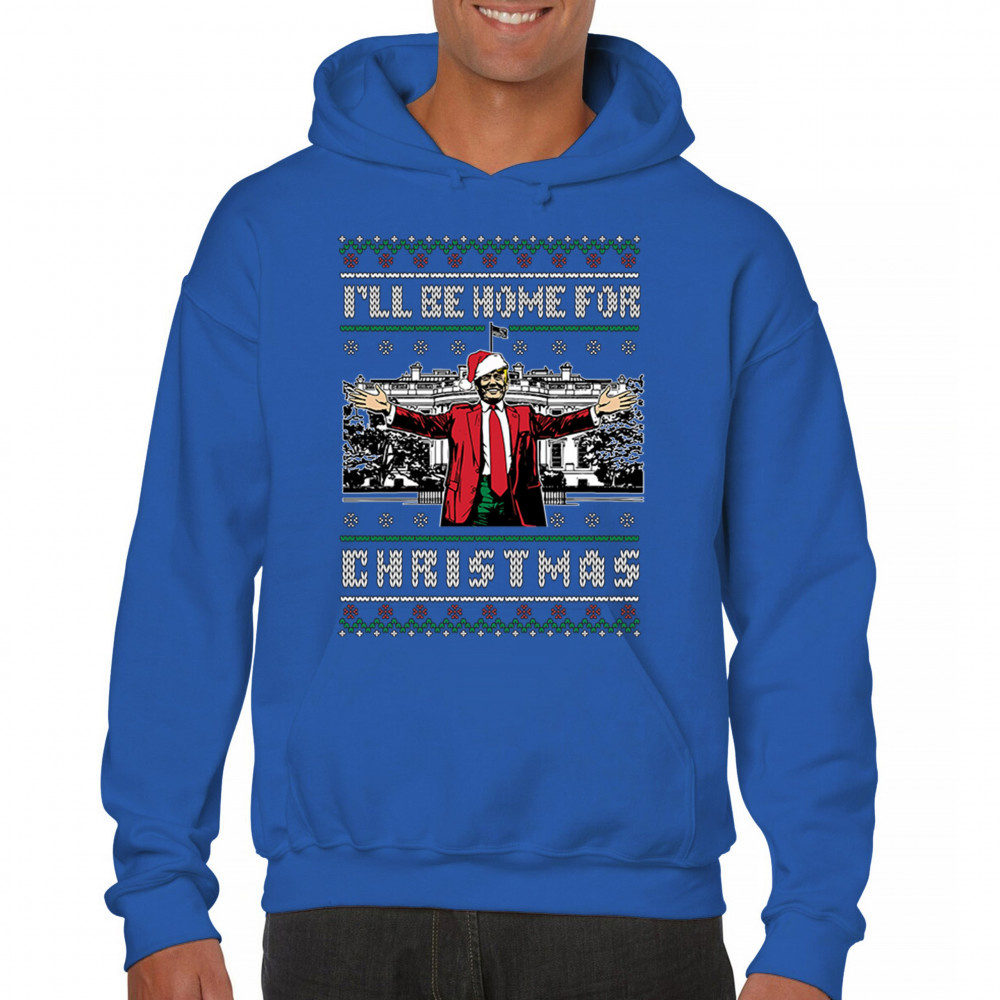 Get into the Christmas spirit with the "I'll Be Home for Christmas" design featuring Donald J. Trump in a festive holiday setting. Perfect for ugly sweater contests, holiday gatherings, and unique gifts for supporters, this humorous design adds a bold, patriotic touch to your seasonal celebrations. Whether for cozy mornings or office parties, it's a must-have for holiday cheer.