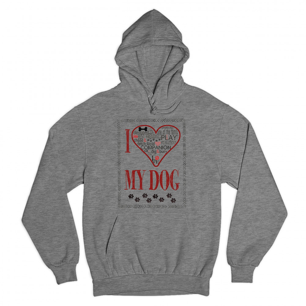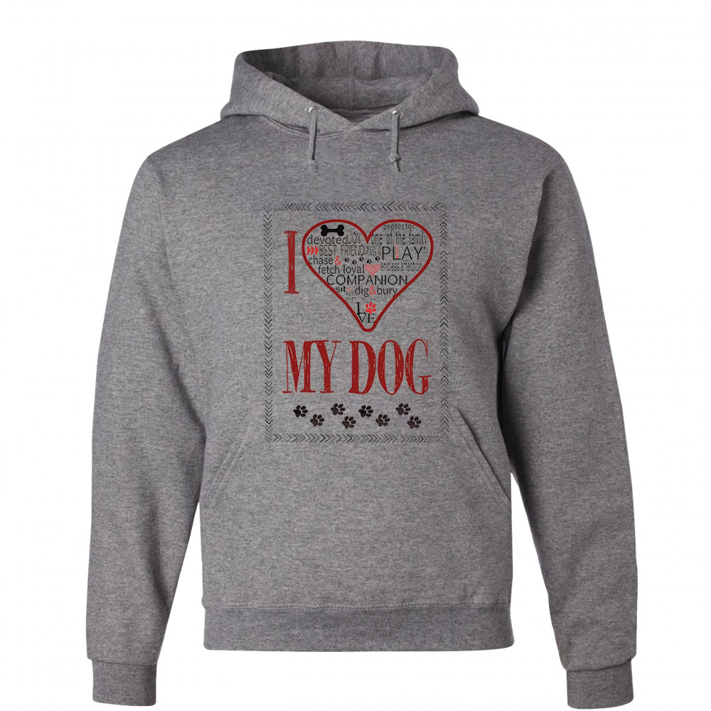 A sweet print featuring a frame inside of which, there are dog tracks and the phrase "I love my dog" in which "love" is replaced with a huge heart. The heart is filled with numerous compliments a beloved dog can be described with. A great choice for any d