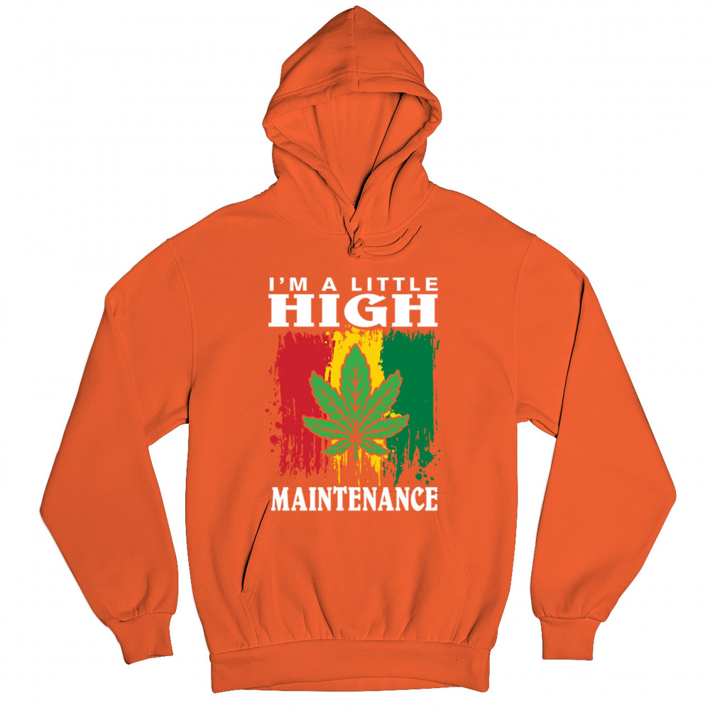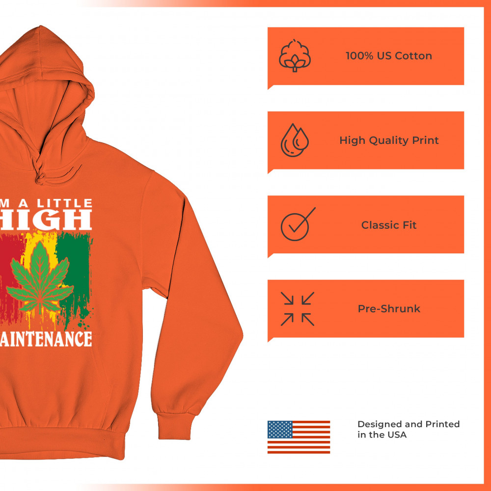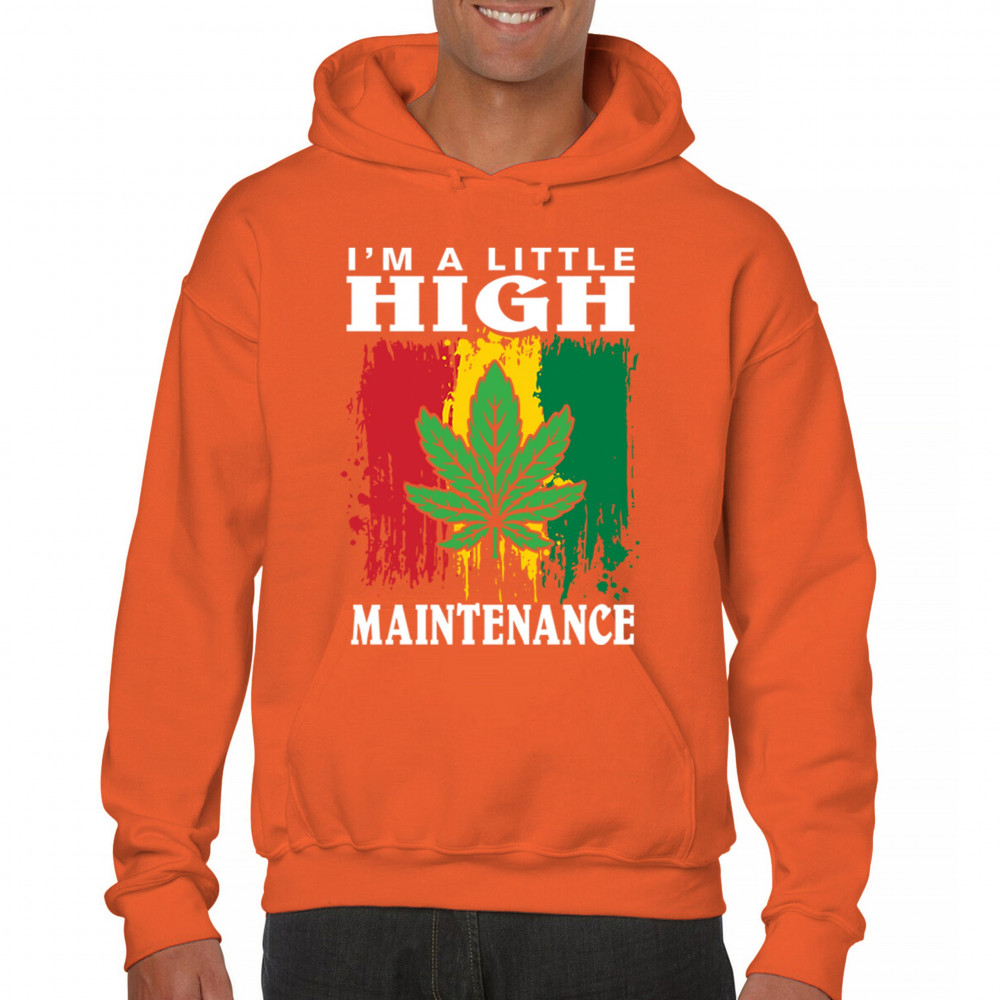 "I'm a Little High Maintenance" design with a bold cannabis leaf and vibrant background. Perfect for fans of Mary Jane, humor, and relaxed, trippy style.