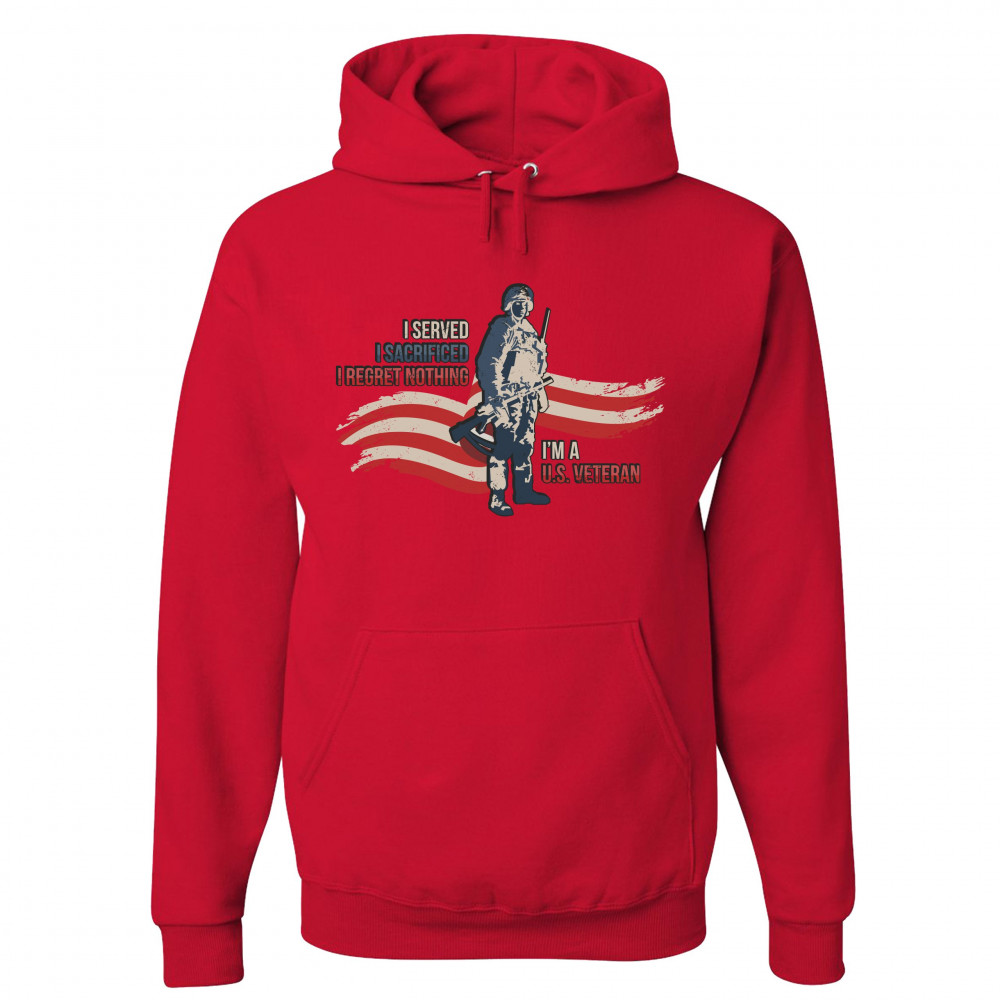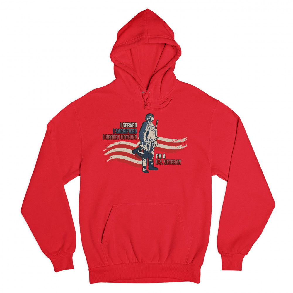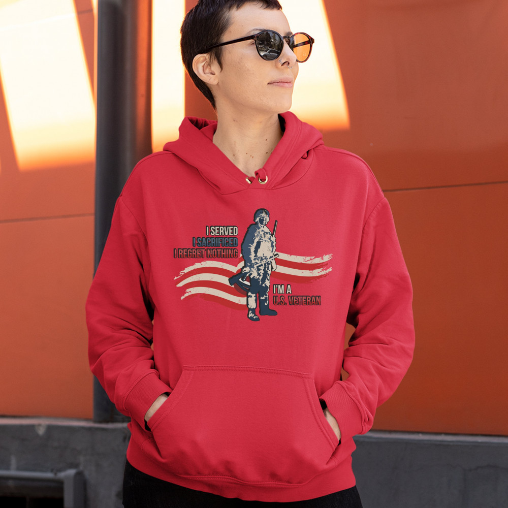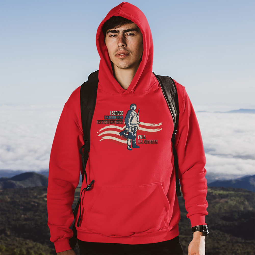 A patriotic print featuring a red-and-white stripe in the background and a soldier holding a rifle. The print says: "I Served I Sacrificed I Regreat Nothing I'm a U.S. Veteran". Great choice to wear on Independence Day or any other patriotic holiday.